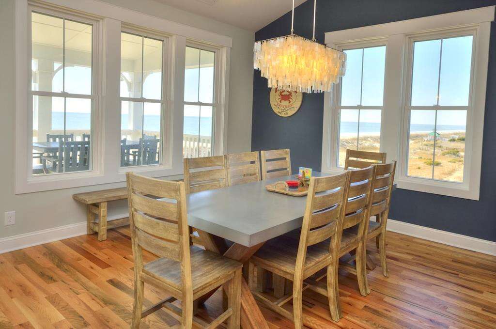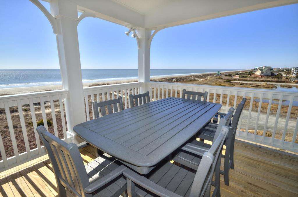 Absolutely gorgeous, Oceanfront home with its own pool with heater in a private setting with breathtaking views of the beach and marsh. Choose a seat from either the front or back decks to relax and enjoy the incredible island and water views. Over 1,200 sq ft of covered deck space and outdoor living space! Located in a quiet section of East Beach subdivision with wide beaches and very little traffic, yet very convenient to the commercial district. The unique setting and private bridge driveway of this home amplify that already private area of the beach. This home boasts double ocean side porches to sit back in your rocking chairs, gaze over the ocean, see the beach, and feel the sea breezes through your hair. The inside of the home is very tastefully decorated, so you can let all of your worries drift away and enjoy your vacation in comfort. The open floor plan allows the gathering of the family throughout the upstairs. The dining room and family rooms have fabulous ocean views so even from indoors, you will have priceless views. Extra dining outside on the upstairs oceanfront porch. All extra-large porches will have plenty of seating to enjoy the views of the Ocean or the sound. One main bedroom is located upstairs, while four additional bedrooms are located downstairs. master-K, BR2-Q, BR3-Q, BR4- 2T, BR5-2T. The luxury, fully equipped kitchen has a 10-foot island with seating for several hungry ones. The kitchen also has a 32-bottle wine fridge. This island bar is also perfect for entertaining all your friends with a full buffet at their fingertips. The massive great room completely encompasses the ocean side of the home. The views are simply breath taking. There are books, puzzles, stereo system, CD player, and extended cable. Departure housekeeping and linens are included. Let "Bridgewater" be where you are able to seize the day. Non-Smoking. Event Home (Additional Fee)