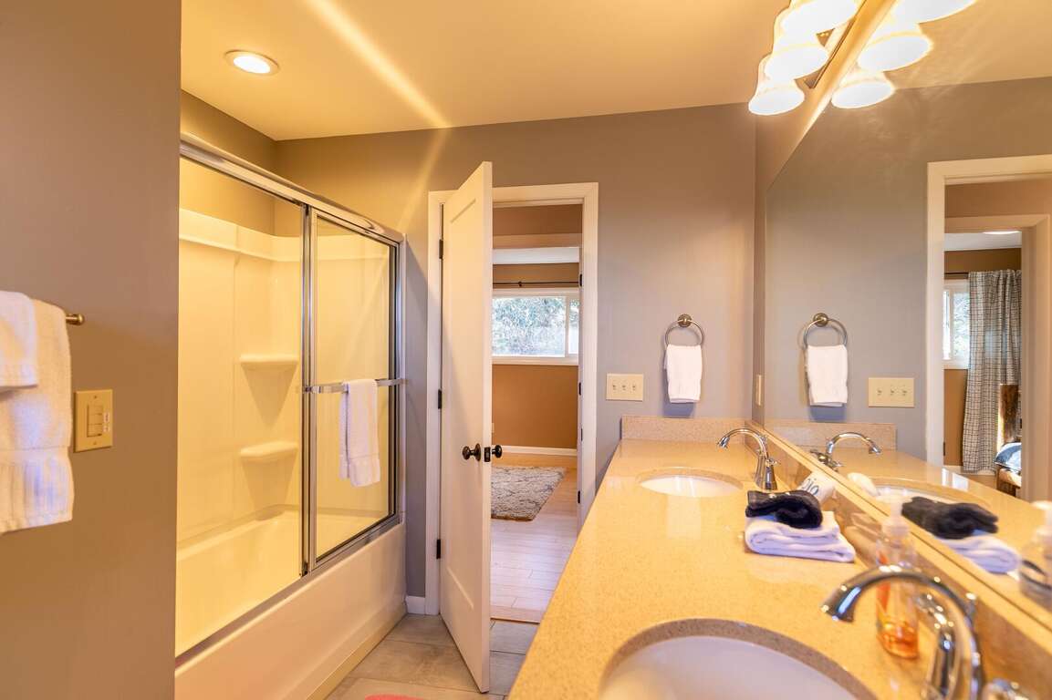 <span style="font-size:11pt"><span style="line-height:normal"><span calibri="" style="font-family:">Down the hall is a full bath with a tub & shower and double vanities. Across from that is a bedroom with a twin-over-full bunk bed, and at the end of the hall is a bedroom with a Queen bed. The master suite is also on this hall, and has a King bed, private deck leading to a flat yard area, and a private bathroom with a tiled shower. </span></span></span><br />