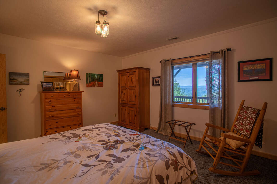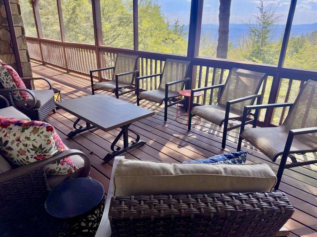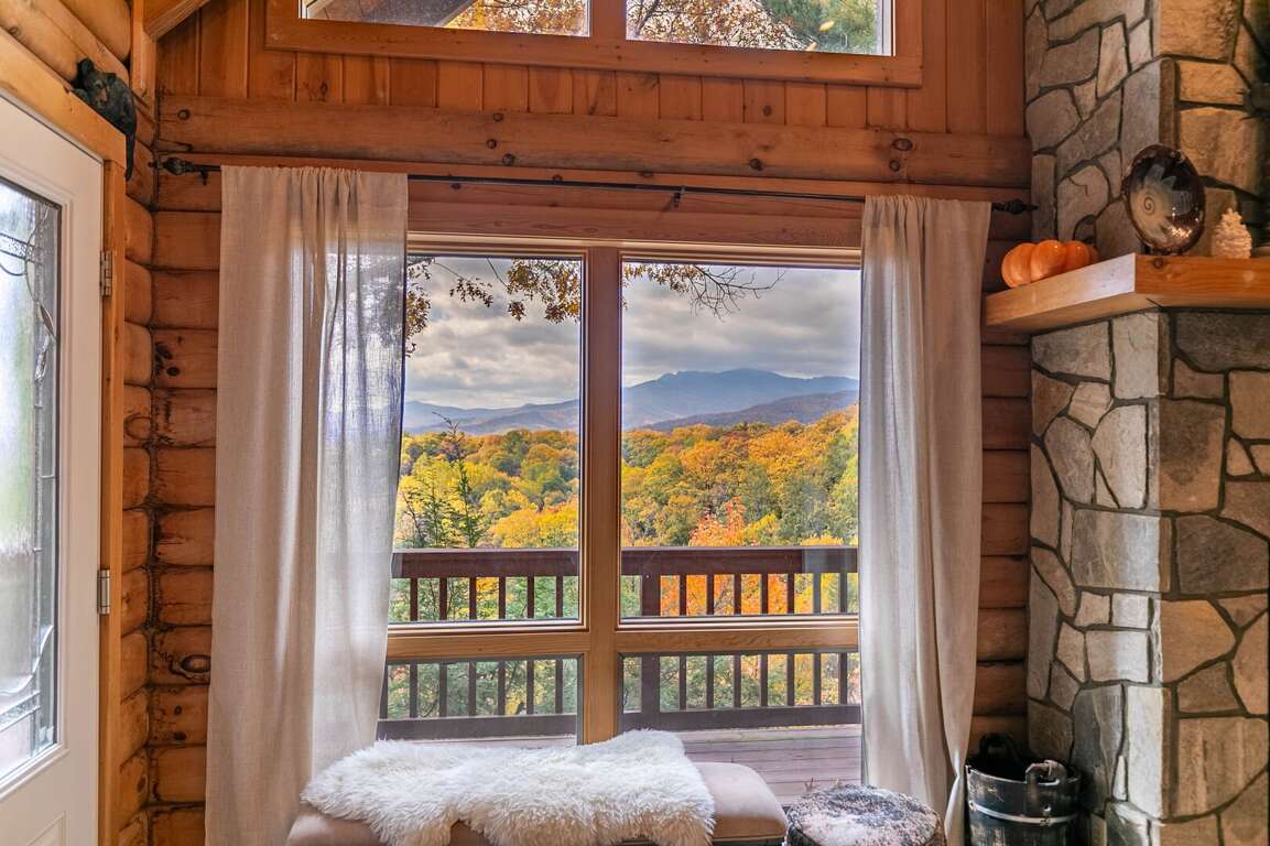 - The living room offers breathtaking views of the Blue Ridge mountains, creating a sense of freedom and tranquility.