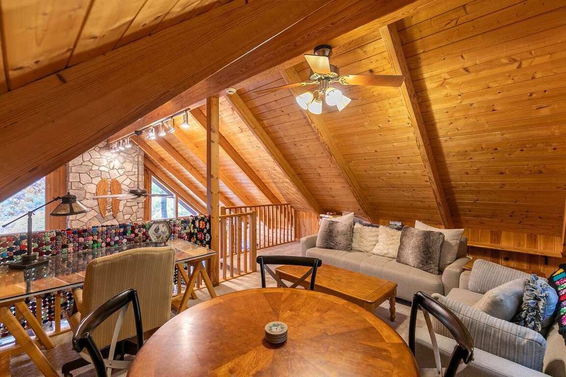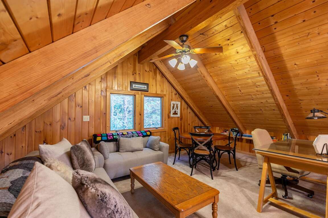 Nestled above the inviting main level, the upper level and loft of Angels Envy offer an additional space for relaxation and productivity, allowing guests to continue enjoying the home's serene surroundings. The loft area provides a cozy spot for hanging out and unwinding, with a sofa, two chairs, and a desk, making it suitable for bringing along school or work materials. This creates work-from-home options, ideal for those seeking a remote getaway without sacrificing productivity. Whether it's catching up on emails, attending virtual meetings, or simply finding a quiet space for creativity, the loft area caters to various needs. The ample natural light and beautiful views from the upper level further enhance the ambiance, providing an inspiring setting for both work and leisure.