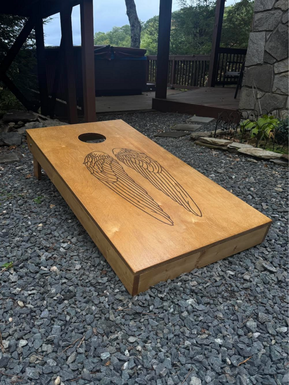 Featuring a large wraparound room with a ping pong table and futon, the lower level of Angels Envy offers a spacious and versatile area for entertainment and relaxation.