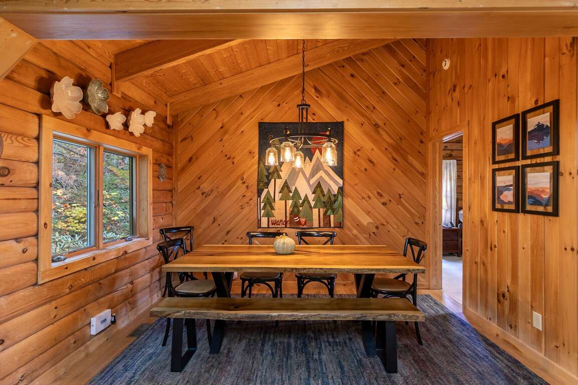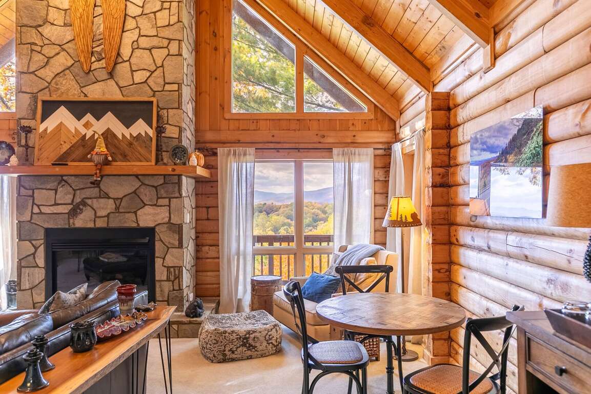 The main level of Angels Envy features a spacious living room with stunning views and a gas log fireplace, a fully equipped kitchen with granite counters and a new gas range, and a dining area with a handmade live edge table for eight.
