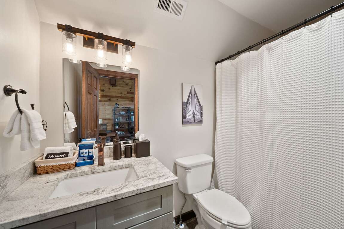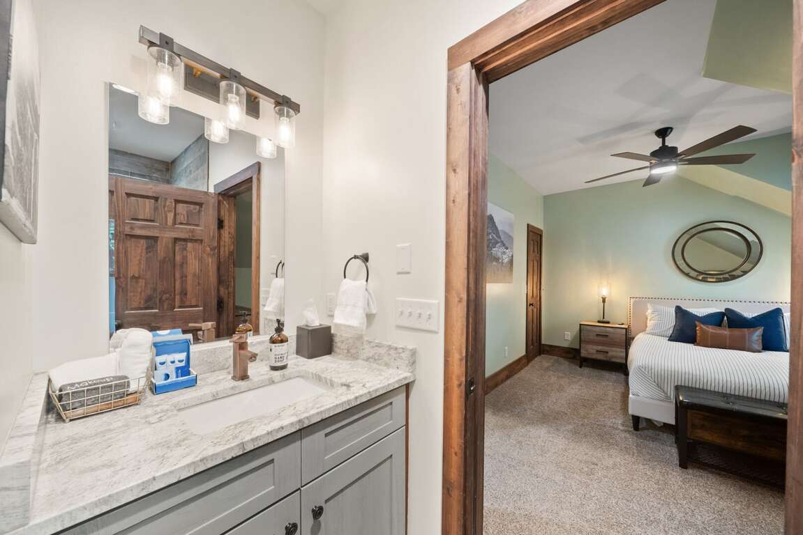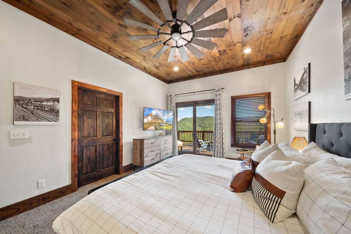 After considering the spacious accommodations and amenities of Cranberry View Lodge, it is essential to review the bedroom configuration, which offers a diverse range of sleeping arrangements for guests. The lower level features two bedrooms with twin over twin bunk beds, while the upper level includes a Queen bedroom with TV, a bedroom with 2 single twin beds and TV, and a loft with a futon. Additionally, the upper level boasts a Queen ensuite bedroom with TV and private bathroom, as well as a bathroom in the hallway. The main level is home to the luxurious Master suite, complete with a King bed, TV, doors to the deck, and a private bathroom featuring a soaking tub, double granite vanities, and a large tiled shower. This thoughtful configuration ensures comfort and privacy for all guests.