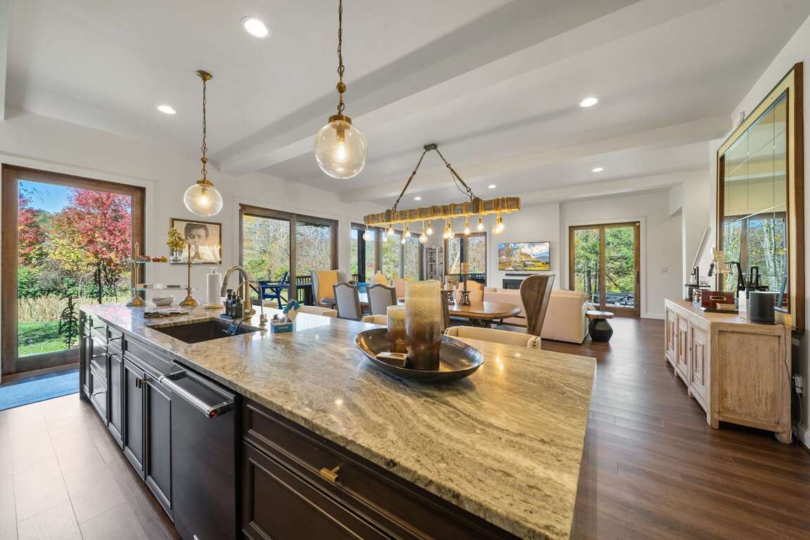 The property's well-appointed interior seamlessly transitions to an impressive kitchen with modern design and an open concept living area, providing a comfortable and functional space for guests to enjoy. The kitchen boasts sleek granite countertops, quality kitchen cabinets, and a gas range, offering a perfect setting for culinary endeavors. The built-in island sink enhances convenience, while ample natural light floods the space, showcasing picturesque pond and mountain views. The open concept living room features a cozy gas fireplace, creating a warm and inviting ambiance for relaxation and socializing. This thoughtfully designed layout allows for seamless interaction between the kitchen and living area, making it an ideal setting for entertaining or simply unwinding in the comfort of this stylish townhouse.
