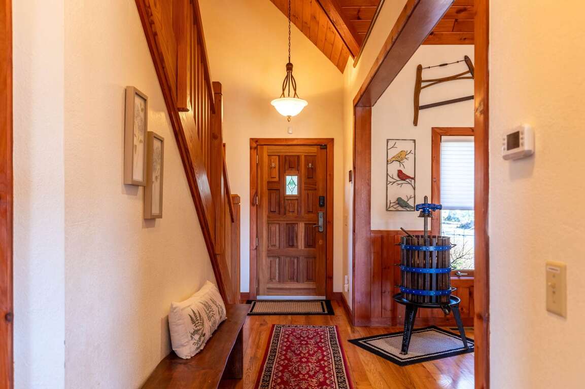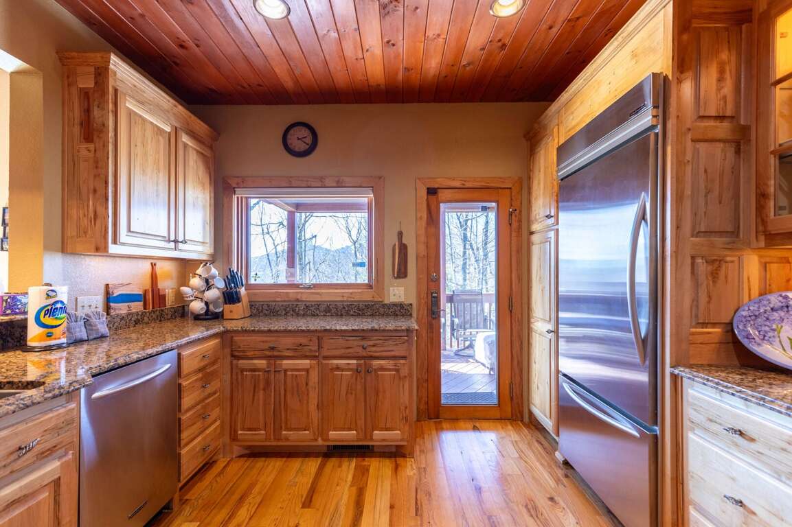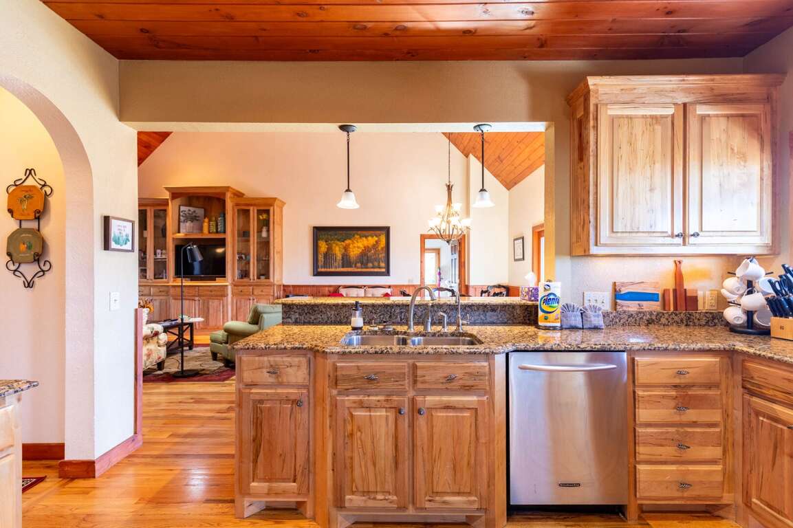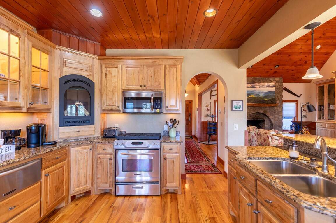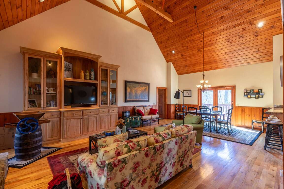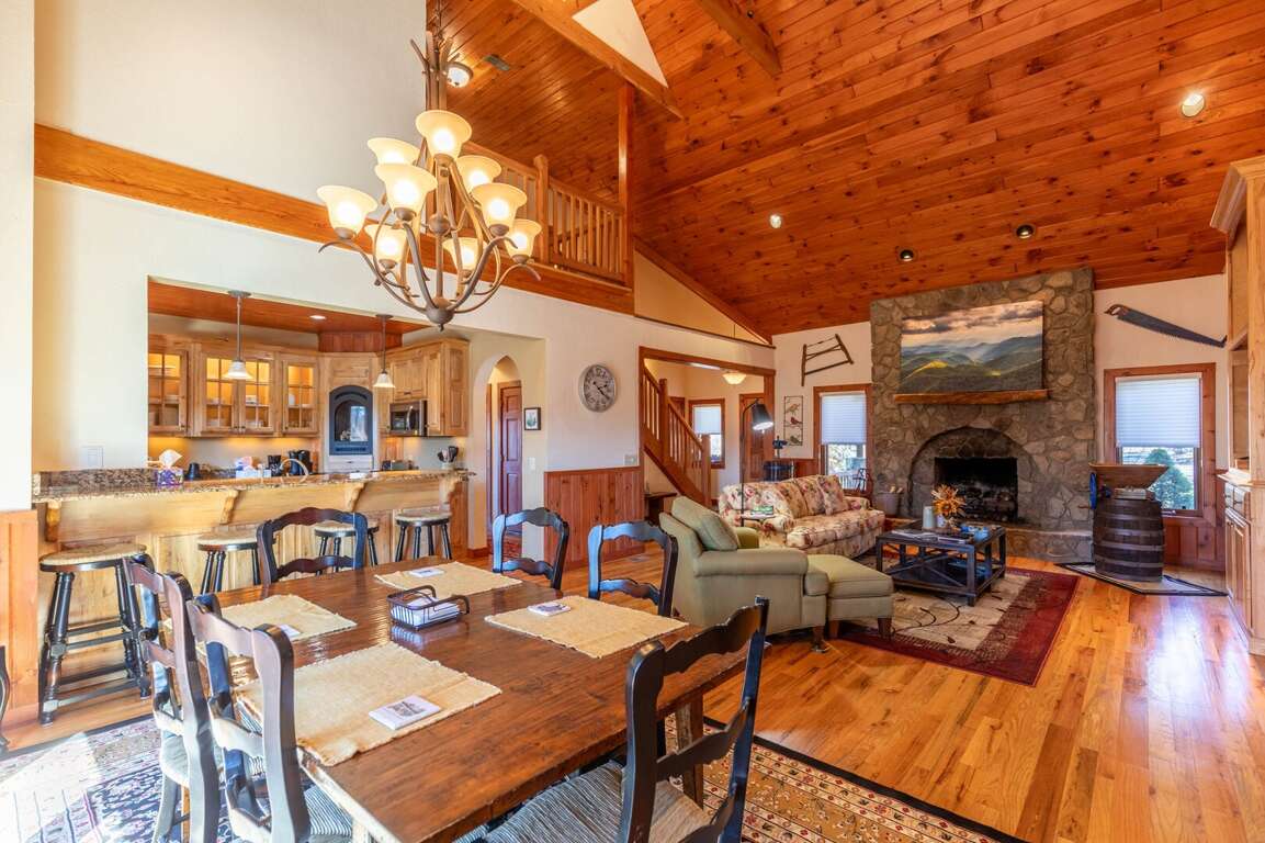Step inside to the welcoming main level where cathedral tongue and groove ceilings, hardwood floors, wainscoting, and a stunning stone gas fireplace create a warm and inviting atmosphere. The spacious living area flows seamlessly into the gourmet kitchen, which features custom cabinetry, granite countertops, high end KitchenAid appliances, a gourmet style 4 burner gas oven, a prep sink, and bar seating. Adjacent to the kitchen, the dining area comfortably seats up to ten, making it ideal for family gatherings and group meals. Easy main level access requires just one step into the home.<br />