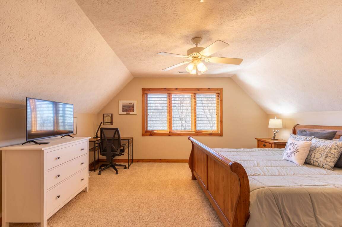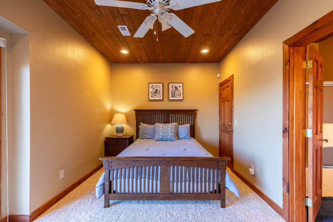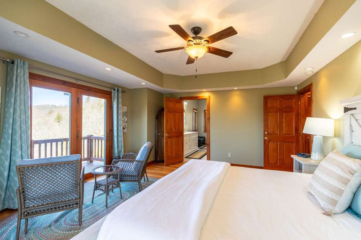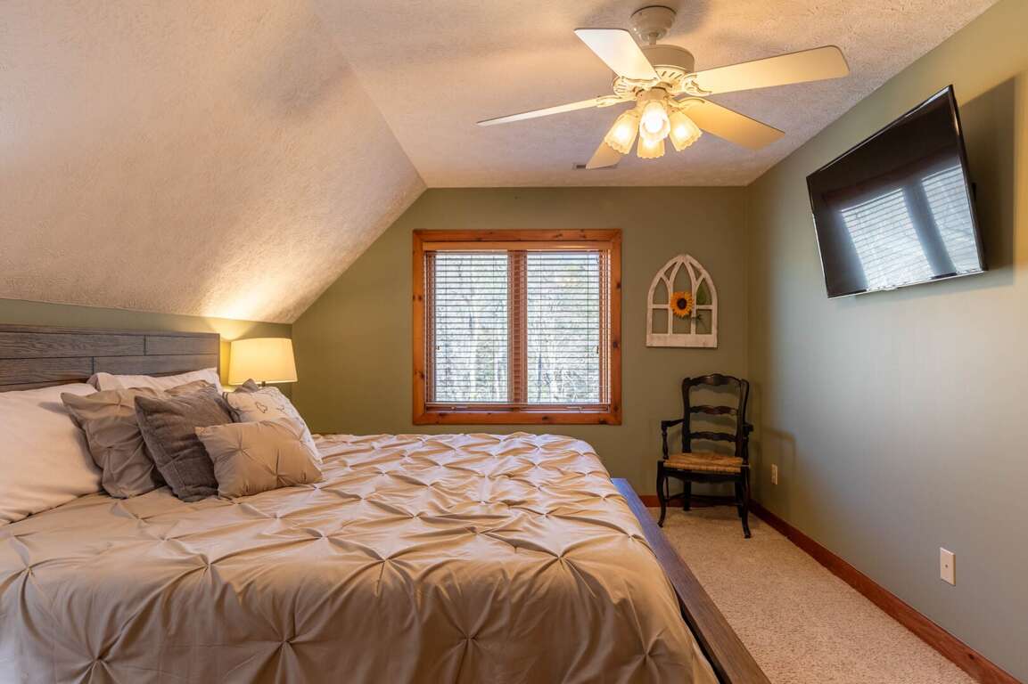 Upstairs, two spacious king bedrooms each feature ceiling fans and TVs and share a Jack and Jill bathroom with a tub and shower combination. A cozy loft area provides additional space to relax, read, or enjoy the mountain setting.<br />
