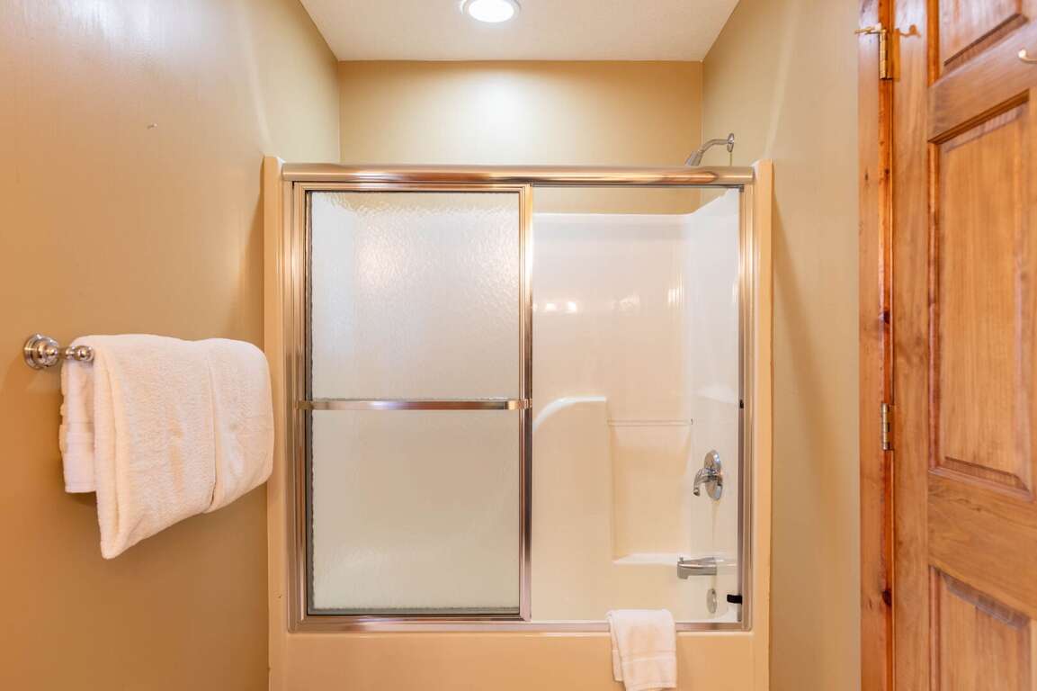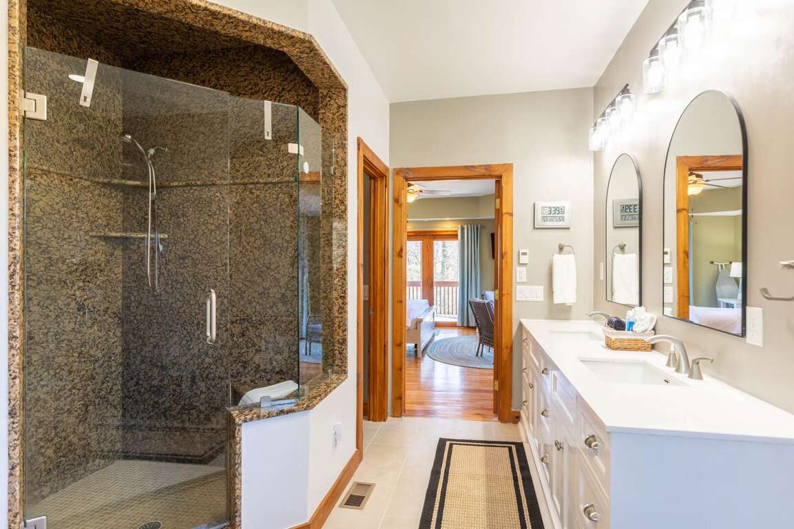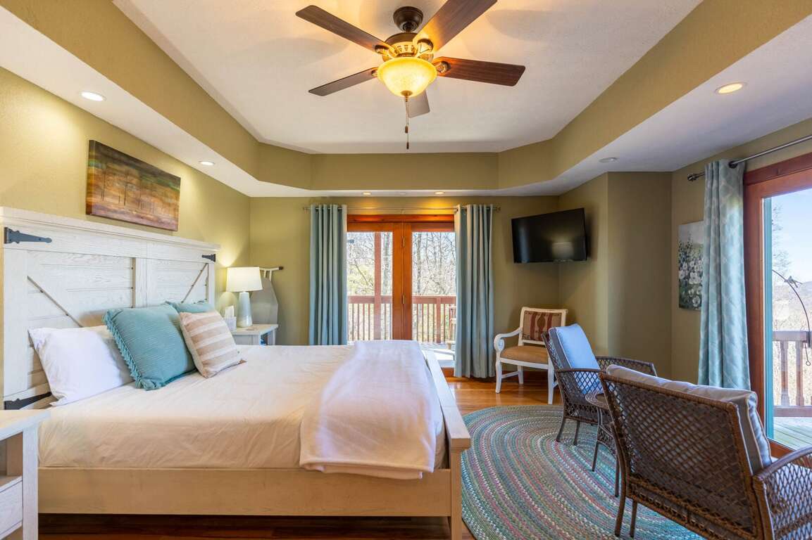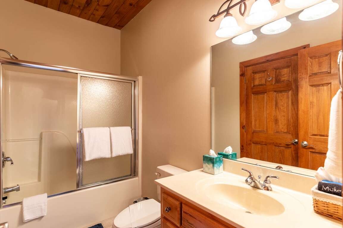 Upstairs, two spacious king bedrooms each feature ceiling fans and TVs and share a Jack and Jill bathroom with a tub and shower combination. A cozy loft area provides additional space to relax, read, or enjoy the mountain setting.<br />