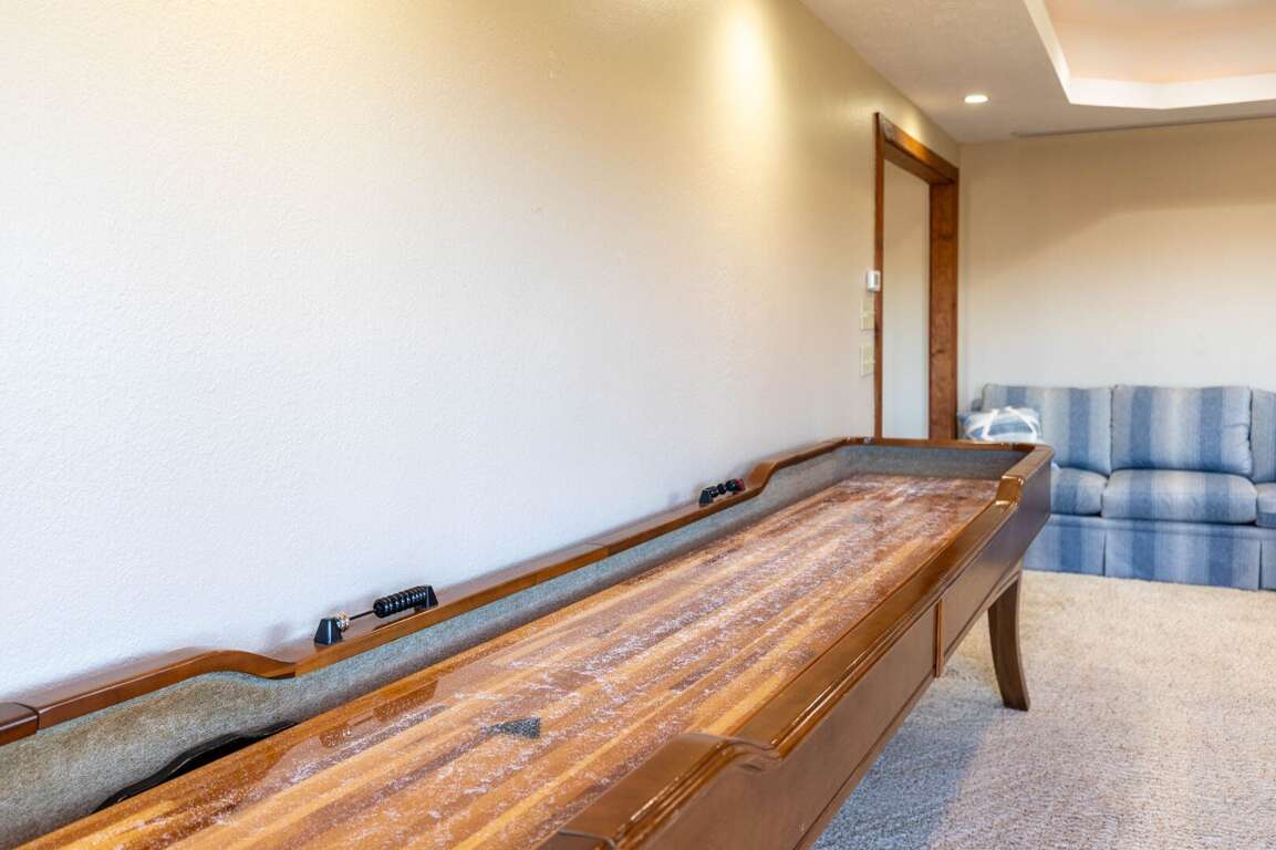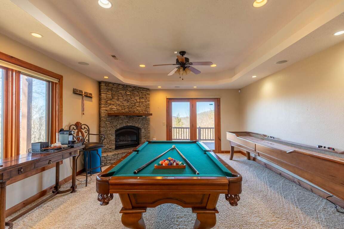 The lower level is designed for entertaining and extended stays, featuring a second living space with a gas stone fireplace, pool table, shuffleboard table, and a sofa. The fourth bedroom on this level offers a queen bed and easy access to a full bathroom with a tub and shower combination. Step outside to the full size lower deck, where the mountain backdrop creates the perfect setting for morning coffee or evening gatherings.<br />