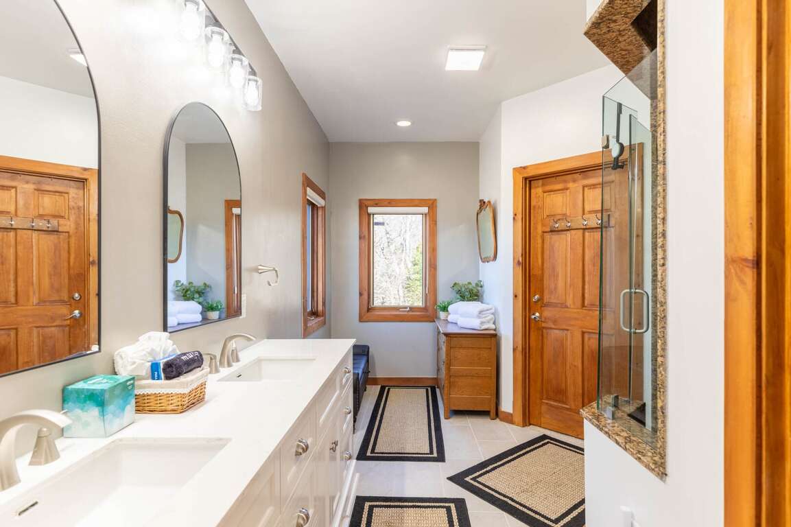 The primary suite on the main level is a true retreat, offering a king bed, tray ceilings, a flat screen TV, and captivating mountain views with access to two decks. The ensuite bathroom includes an updated double vanity, a large custom tiled walk-in shower, and heated floors<br />