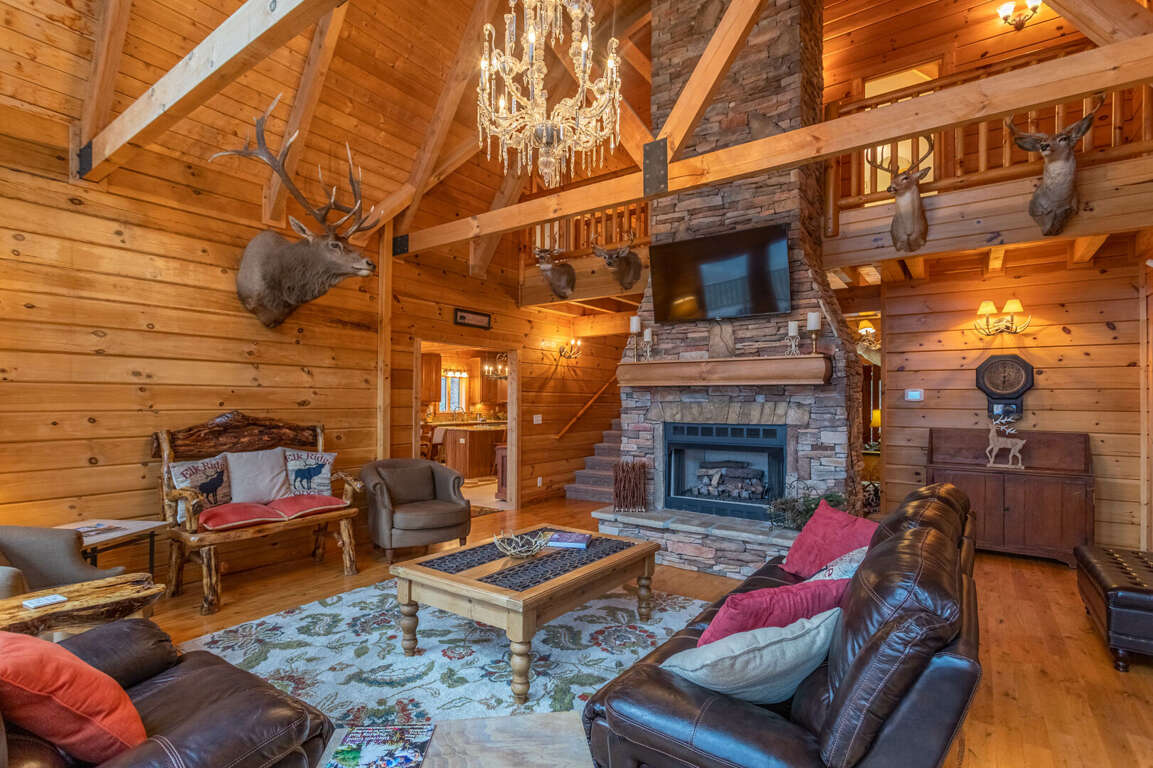 Perched above the charming town of Banner Elk, this spacious cabin offers stunning vistas and an inviting retreat for your mountain getaway. Step into the grand hall, where a striking stone chimney rises from the heart of the home. Cathedral ceilings and a wall of windows showcase the spectacular scenery, bringing the beauty of the outdoors inside. The lodge is decorated with impressive deer and elk mounts from Ted Turner's personal ranch, adding to its rustic charm. <br />