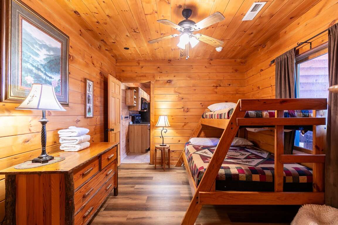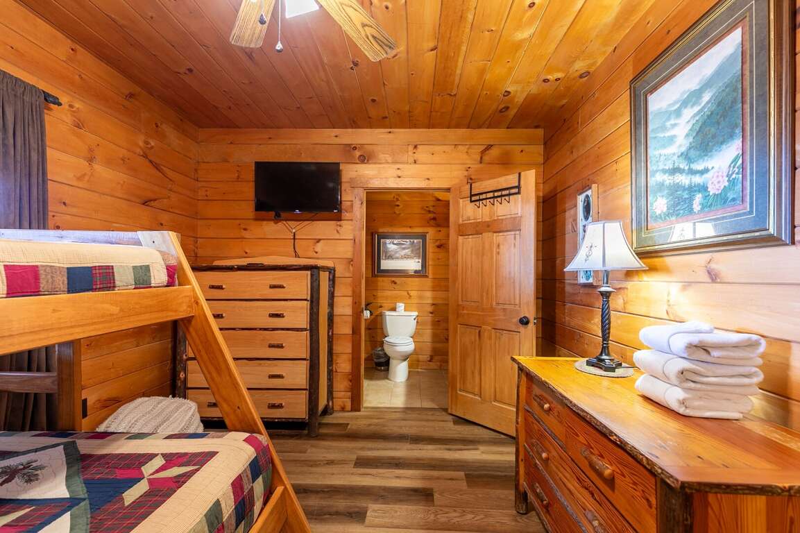In the Beary Relaxing Cabin, guests will find comfortable sleeping arrangements designed to accommodate up to 11 people across its 4 bedrooms, providing a restful retreat after days filled with mountain adventures. The cabin features a variety of sleeping options to suit different preferences, including a queen bed in Bedroom 1, two twin beds in Bedroom 2, two rustic log queen beds and a TV in Bedroom 3, and a twin over full bunk bed with a private bath in Bedroom 4. Additionally, the open loft offers extra sleeping space with its seating and games. To maximize comfort in shared sleeping spaces, the cabin provides ample bedding, cozy linens, and thoughtful touches to ensure a peaceful night's sleep for all guests. For those accommodating large groups in vacation rentals, these versatile sleeping arrangements offer flexibility and convenience, making the Beary Relaxing Cabin an ideal choice for group getaways.