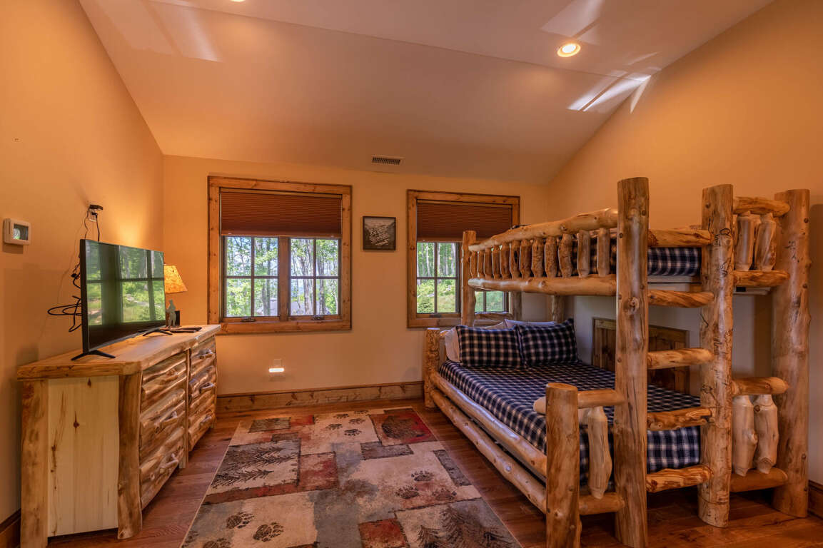 Upon entering the luxurious cabin at The Refuge at Eagles Nest, guests will find a well-appointed bedroom configuration designed to provide comfort and privacy for their stay. The interior design of the bedrooms combines rustic elegance with modern comforts, creating a cozy and inviting atmosphere. The bedding options cater to various preferences, ensuring a restful night's sleep for all guests. The bedroom configuration includes a main level master suite with a king-sized bed and en-suite bathroom, a lower level bedroom with a king bed and private bathroom, an upper level queen bedroom, an upper level king bedroom, and a bunk room with 2 twin-over-full bunk beds, accommodating up to 6 guests. Each bedroom is thoughtfully designed with high-quality furnishings and luxurious touches, making The Refuge at Eagles Nest a perfect retreat for families or groups seeking both freedom and comfort.
