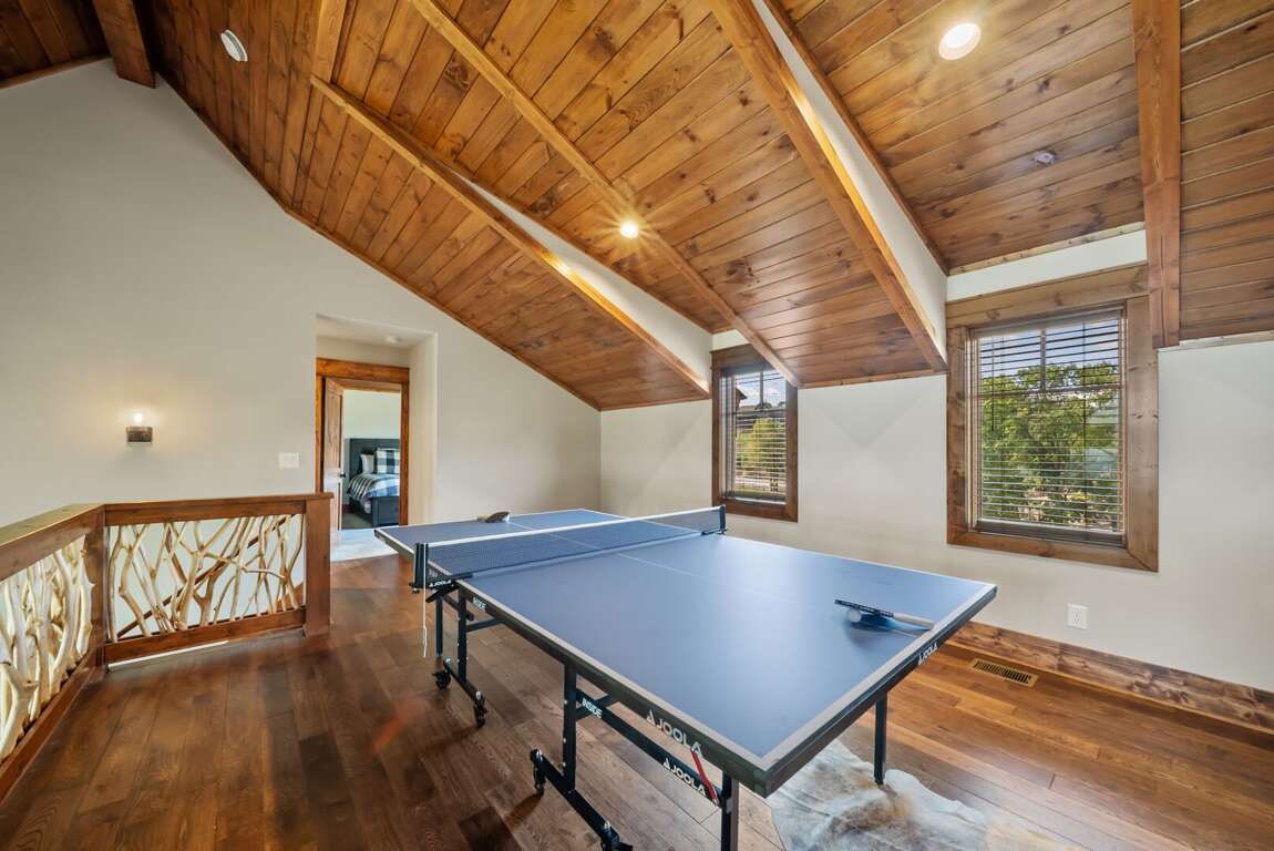 - The primary bedroom on the main level features a king bed and tasteful decor, creating a cozy and elegant atmosphere. - The queen bedroom includes built-in twin over twin bunks, perfect for a family or group of friends, and is adorned with charming, mountain-inspired decor. - The third bedroom boasts a king bed and a picture window with breathtaking views, complemented by soothing and stylish decor.