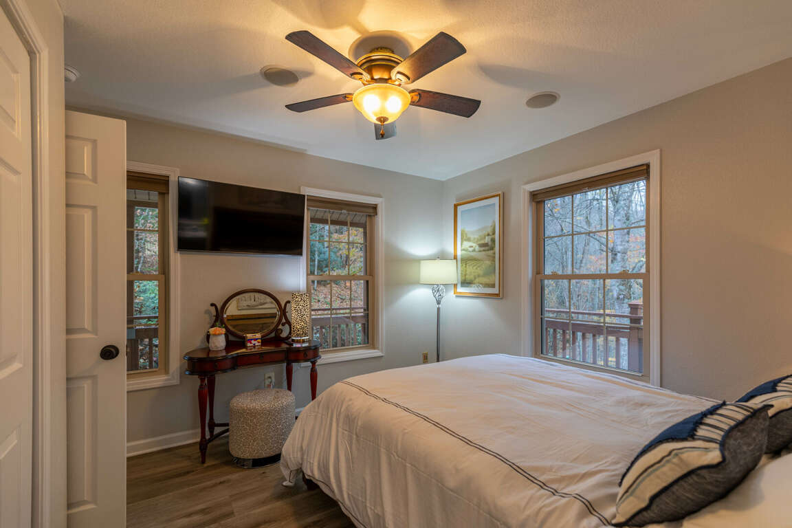 - A queen bedroom on the main level, elegantly decorated with cozy furnishings and serene mountain-themed decor.