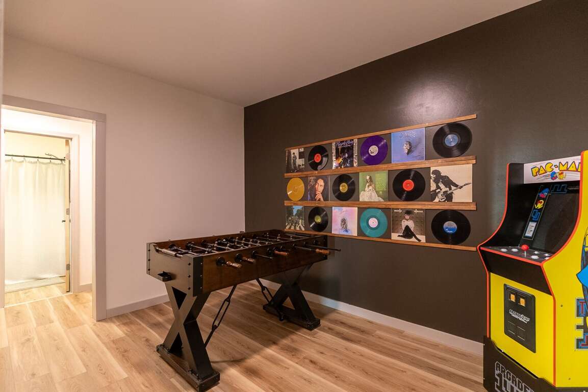 Downstairs, you will find the comfortable family room with space to enjoy a movie together on the SmartTV or head around the stairs to the game room to play a few rounds of foosball or a friendly game of Pac-Man. This lower level includes the second Queen suite. This bedroom features a Queen bed, ceiling fan, standing mirror, dresser, closet, and Smart TV. The ensuite full bathroom has a vanity sink and shower/tub. The bathroom can be accessed through both the bedroom and the hallway. <br />