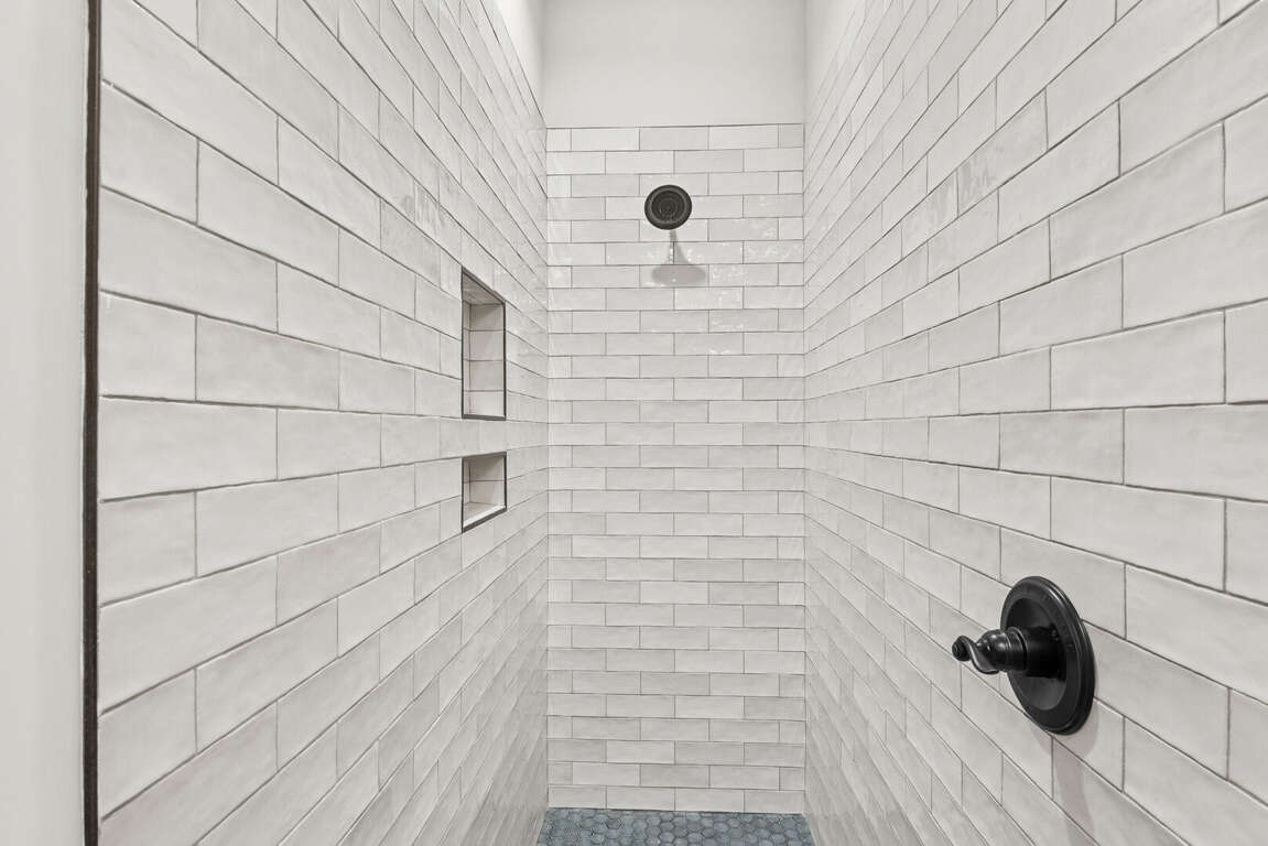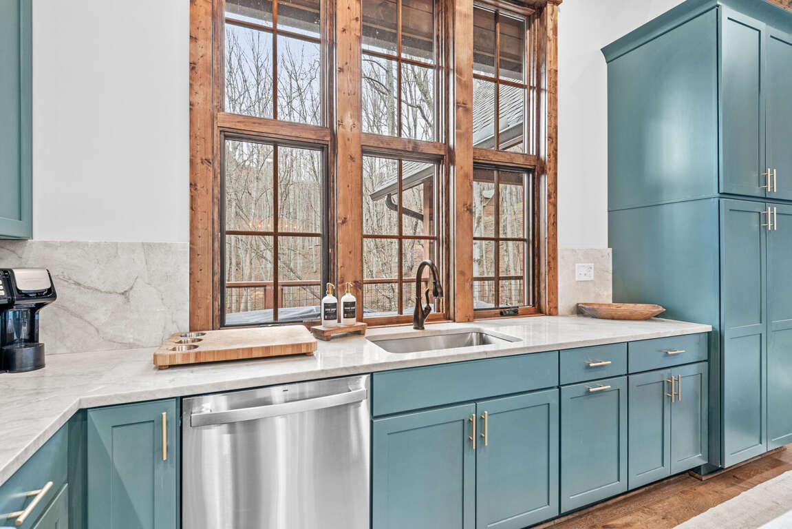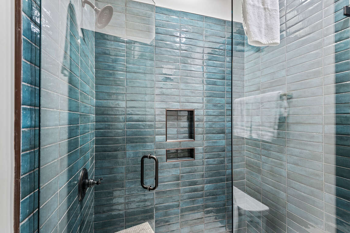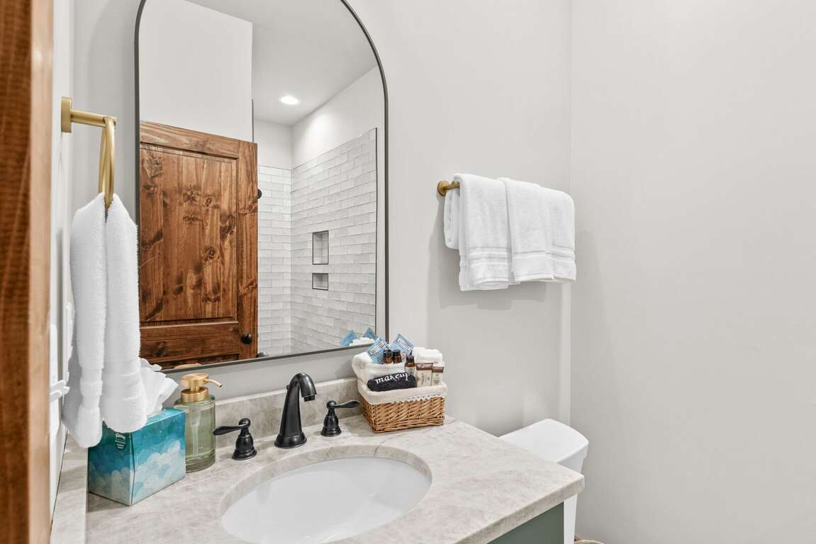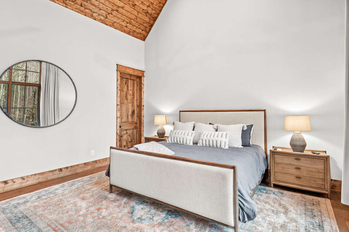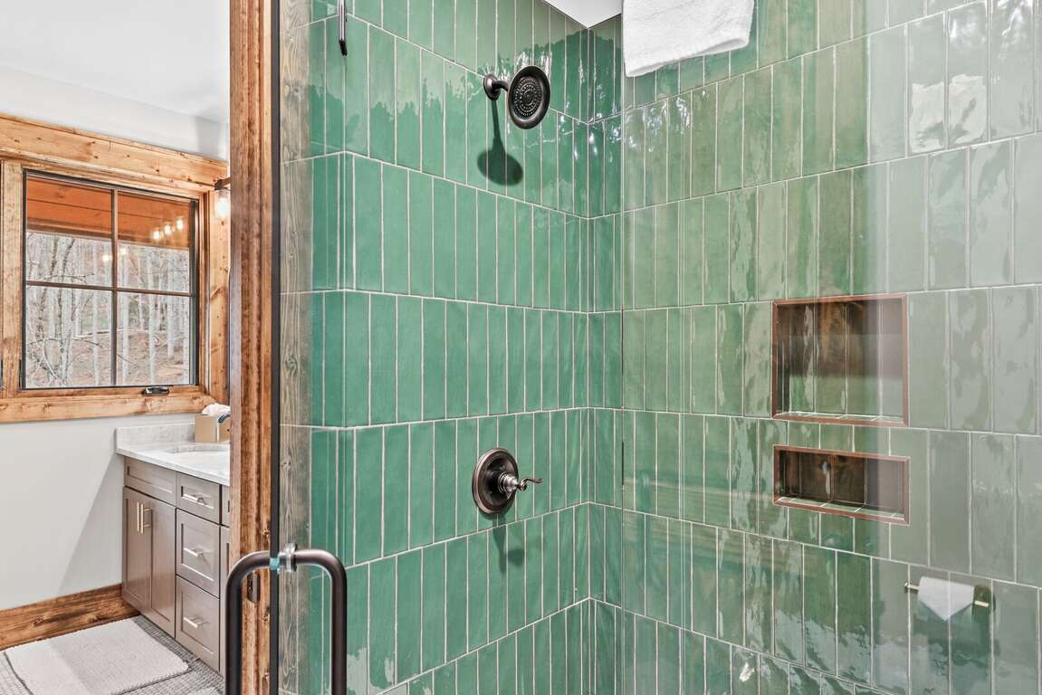 The main-level king suite is calm and inviting, with a ceiling fan, and a big TV. The attached bathroom has a double granite vanity and a beautiful green tiled shower that adds a little luxury.<br />