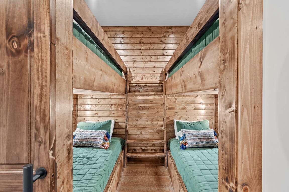 Head downstairs for even more space to relax. The den has another gas fireplace, a flatscreen TV, a big cozy sofa, and leather chairs—great for movie nights or just lounging. There's a fun bunk nook with two twin-over-twin built-in bunks that’s great for kids or extra guests. Just past the wet bar, you'll find another king bedroom with a ceiling fan and TV, plus a bathroom with double granite sinks, a soaking tub, and a tiled shower. Across the den, there’s a third king suite with its own bathroom, TV, and ceiling fan. The bathroom features granite counters and a tiled shower.<br />