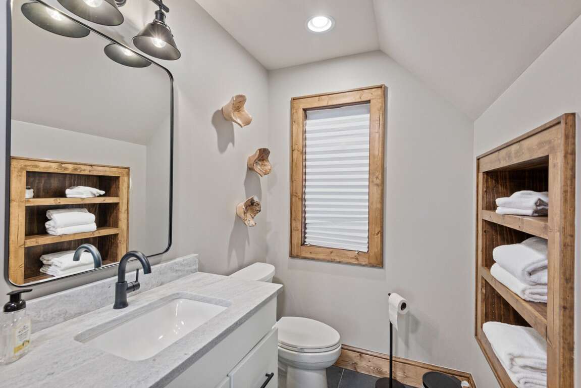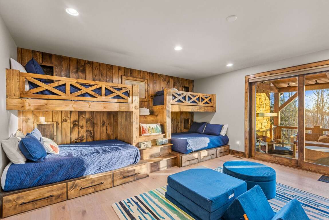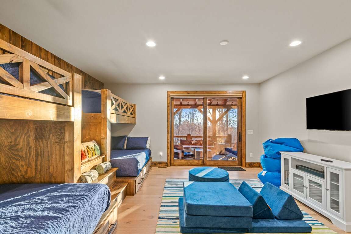 The spacious Bunk Room, also on the main level, is a whimsical and inviting space for children or extra guests. With two sets of beautifully crafted twin-over-queen bunk beds, this room is both functional and fun. A large mounted TV, beanbag chairs, a nugget couch, and ample space for play create an atmosphere of carefree relaxation. The room opens to the deck, offering easy access to the outdoors. Adjacent to the Bunk Room is a full bathroom, featuring a shower-tub combo for added convenience.<br />