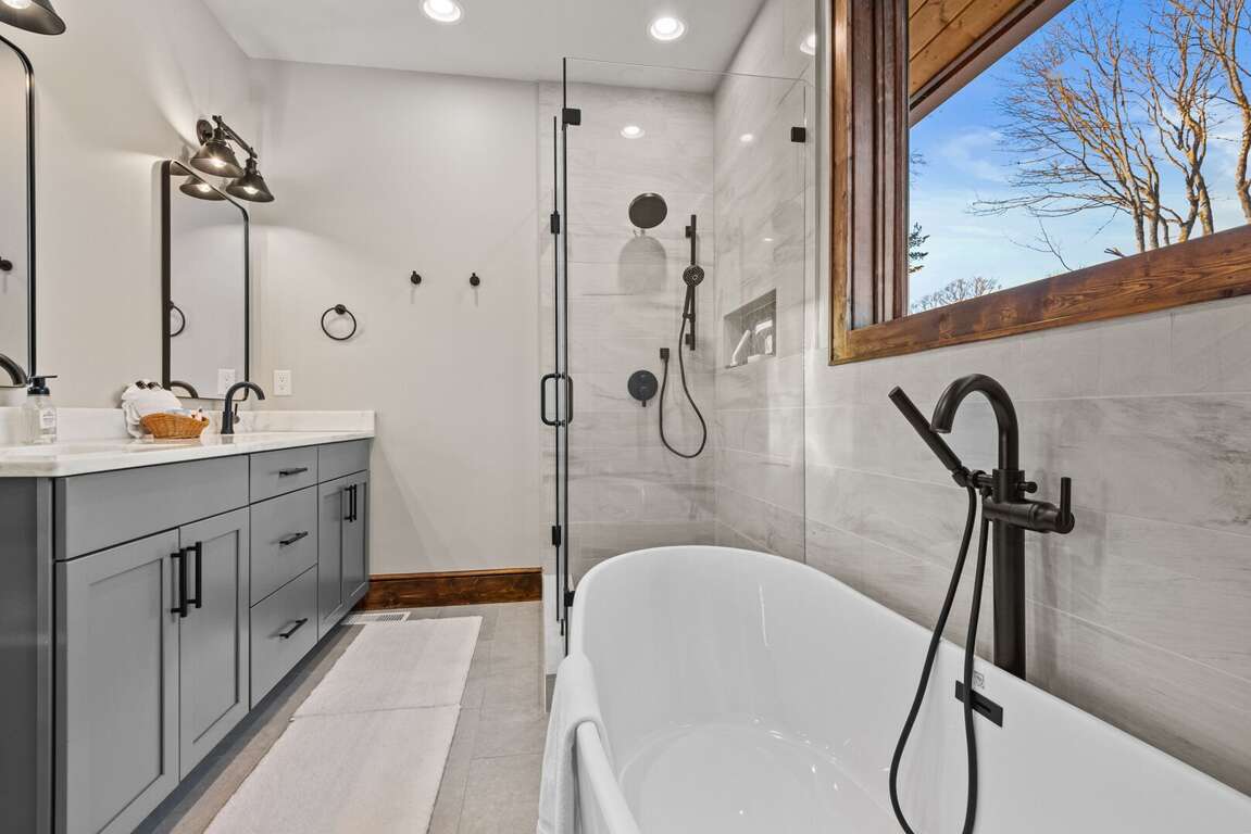 The main level houses the primary king suite, a luxurious haven offering both comfort and convenience. Step into this tranquil retreat, where you’ll find a king-sized bed, a mounted TV for unwinding, and private access to the deck, where the mountain air awaits. The ensuite bathroom makes daily preparation a joy, with double vanities, a custom-tiled shower, and a grand soaking tub, perfect for a long, relaxing bath after a day of exploring.<br />