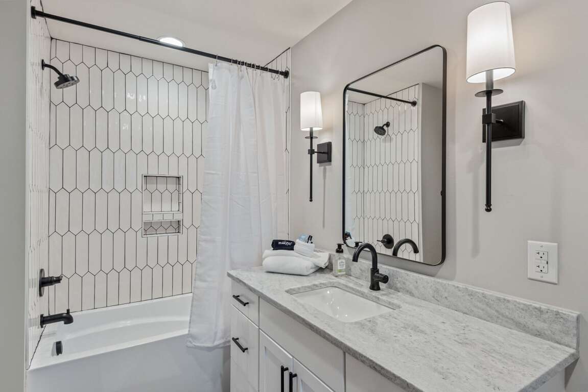 Just up the stairs to the second level, guests will find the final bedroom suites along with a tucked away desk nook for the work that occasionally must be done. The second king suite is tastefully furnished and thoughtfully designed. The ensuite bathroom boasts another custom-tiled shower. Just down the hall is the final queen bedroom and right next to it, the fourth bathroom, which includes a shower-tub combo. Each bedroom is equipped with a mounted TV, ensuring that everyone can unwind in privacy and comfort.<br />