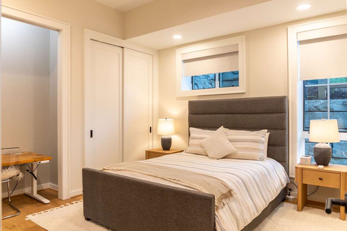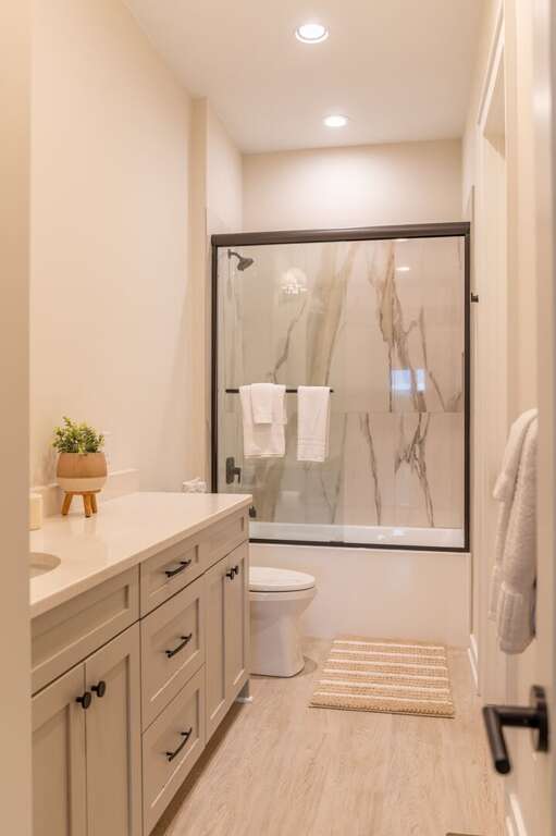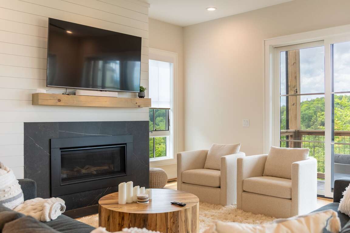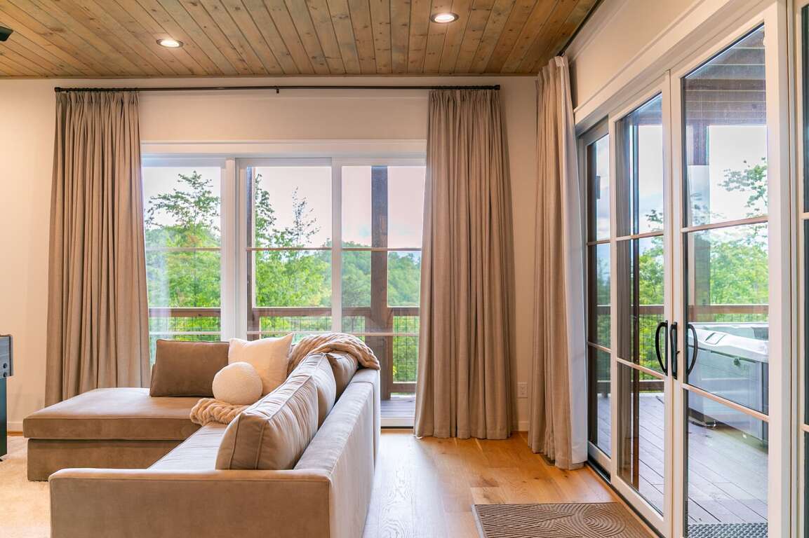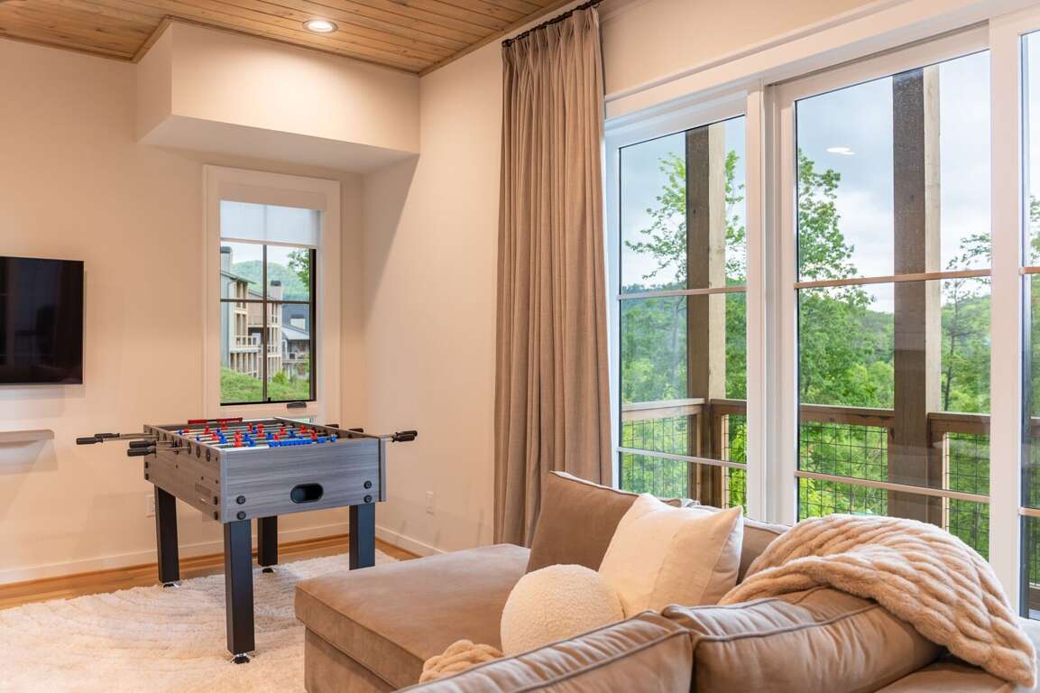 The lower level of the home is all about fun and flexibility. A cozy lounge area features a sleeper sectional sofa, a flat-screen TV, and a raised twin bed that’s great for kids or extra guests. This level includes a foosball table, a mounted arcade cabinet, LEGO, board games, and toys for children, creating a space that will delight guests of all ages. Two more sets of sliding doors open onto another luxurious deck, where a private hot tub awaits—perfect for unwinding after a day of hiking or exploring. The third bedroom is located on this level as well, offering a comfortable queen bed and a desk, ideal for remote work or quiet reading. A full bath with a shower/tub combo and a spacious quartz vanity rounds out the space, making it perfect for families.<br />