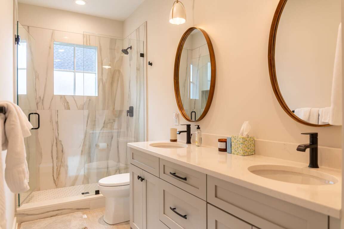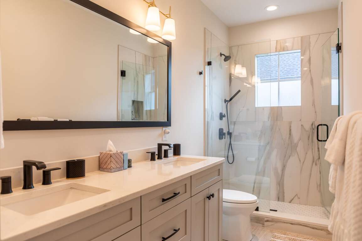 Upstairs, there are two luxurious king suites. The primary suite offers a private covered balcony with breathtaking views. This suite spares no comfort, offering a large smart TV, and an ensuite bathroom with a custom-tiled shower and a quartz double vanity. The second suite mirrors this comfort with its own smart TV and beautifully appointed ensuite bath featuring another tiled shower and double vanity, making it perfect for couples or friends traveling together.<br />