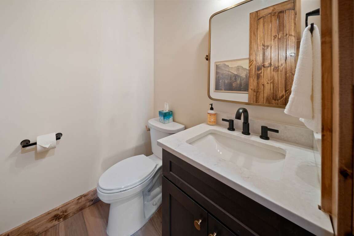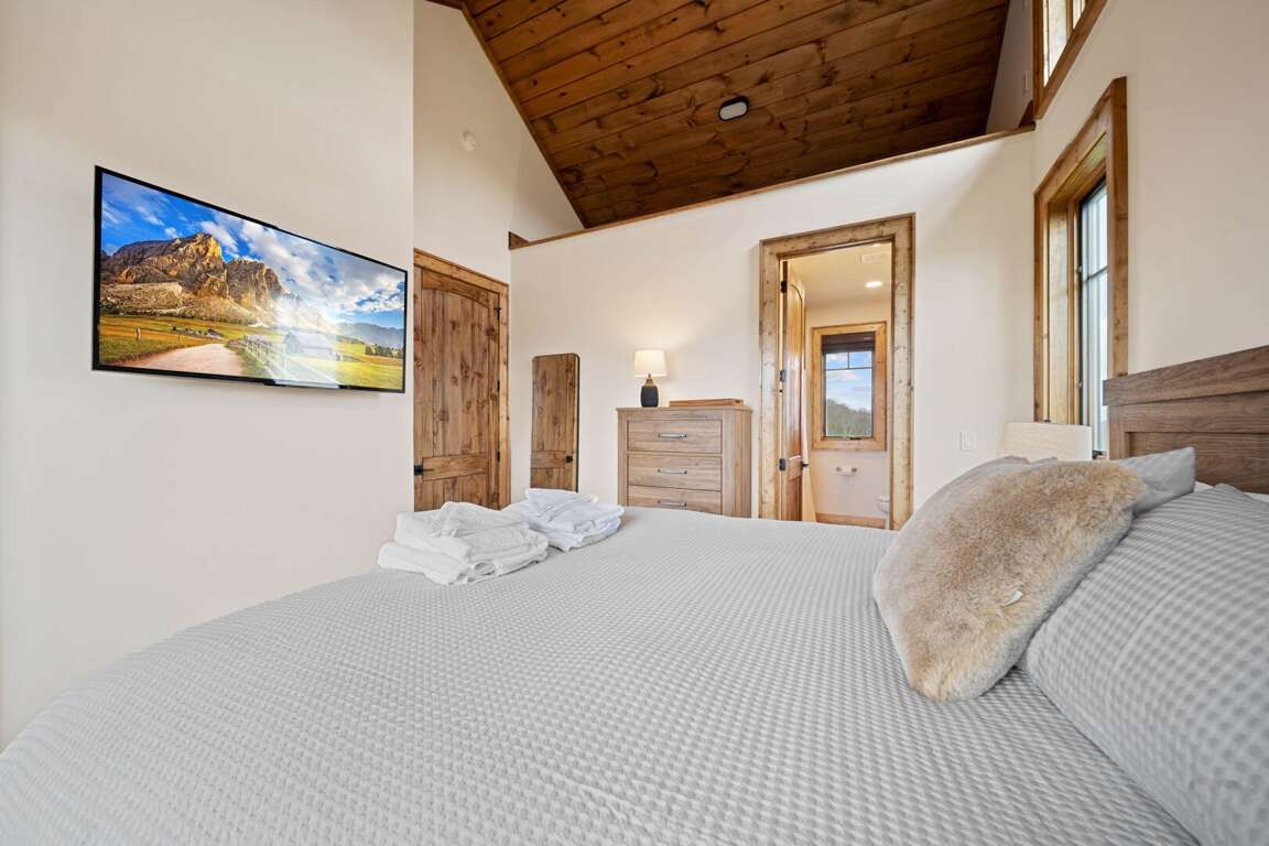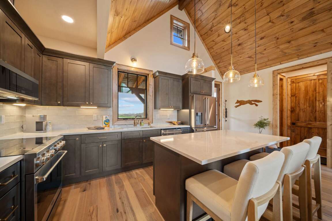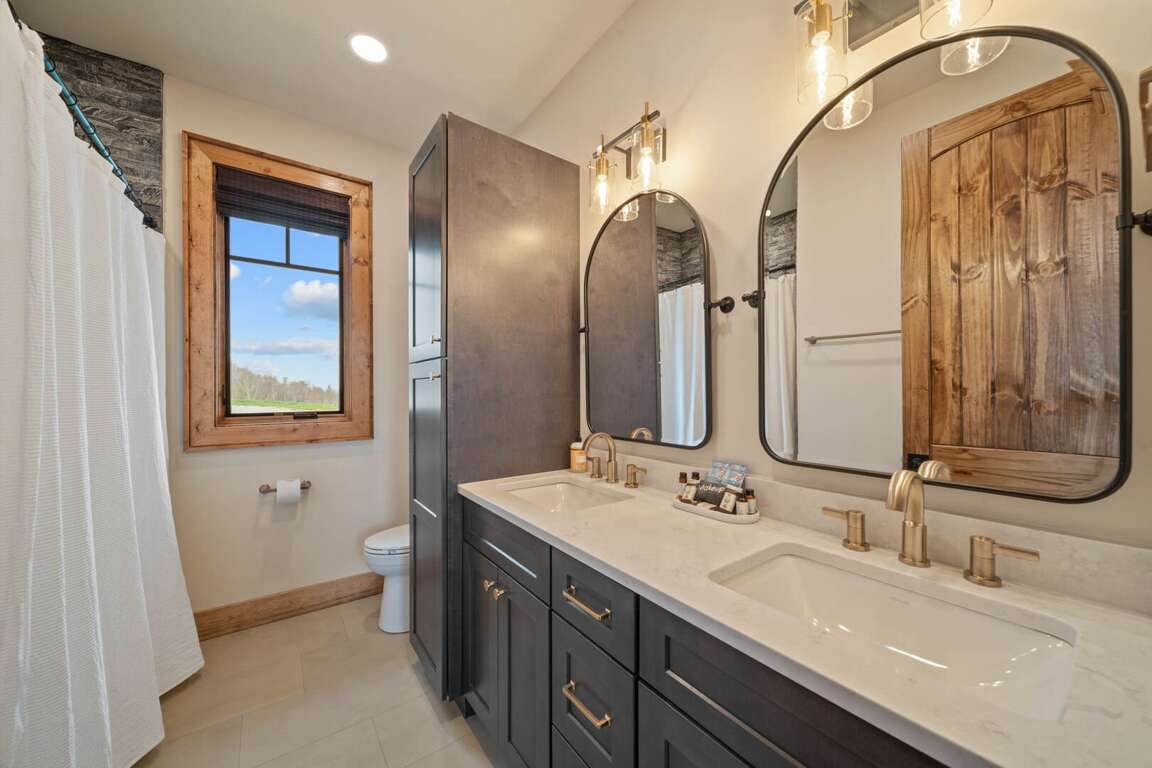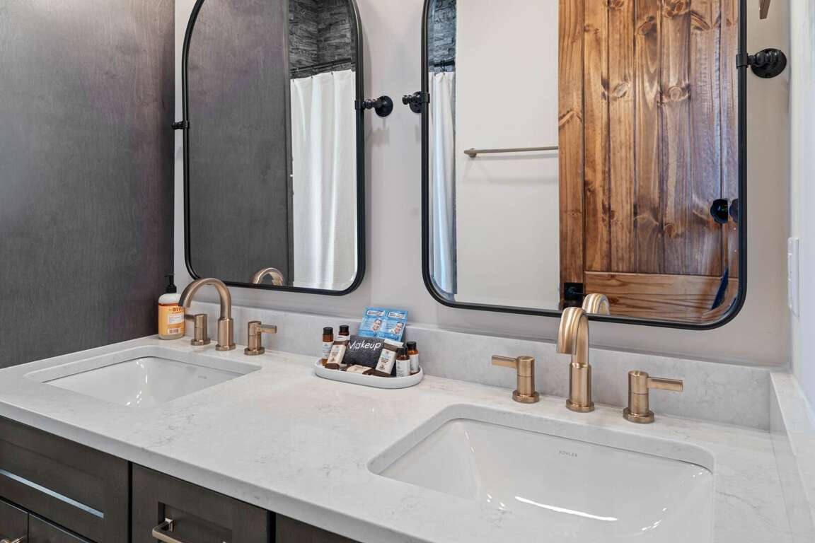 Red Fox Run offers two separate king suites, one on either side of the great room. Both offer the ultimate comfort with vaulted ceilings, king-size beds, and grounding mountain views from the windows. Each suite boasts a luxurious ensuite bathroom with quartz-topped double vanities. One bathroom features a custom stone tile shower, while the other offers a custom stone tile shower/tub combo—both designed with elegance and tranquility in mind.<br />