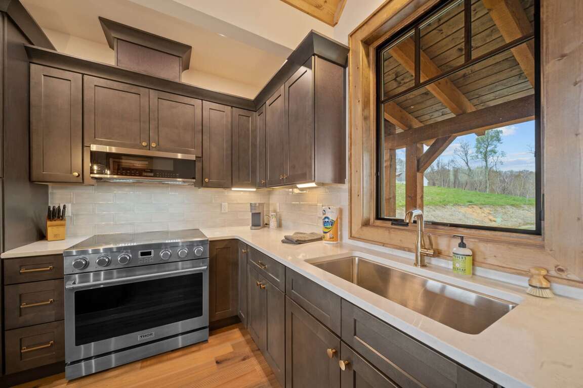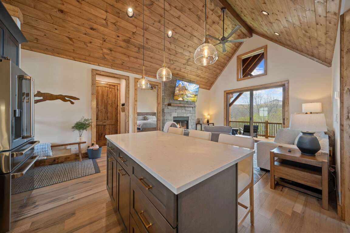 Step into the spacious great room with soaring vaulted ceilings. The beautifully designed kitchen features custom cabinetry, sleek quartz countertops, and high-end stainless steel appliances, all centered around a large, functional island. Stocked with basic kitchen supplies, it’s ready for you to bring your culinary creations to life to be shared with those you love. The open layout seamlessly flows into the cozy living room, centered around the stunning custom stone fireplace. Convenient gas logs and a large TV above provide the perfect ambiance for conversation and relaxation.<br />