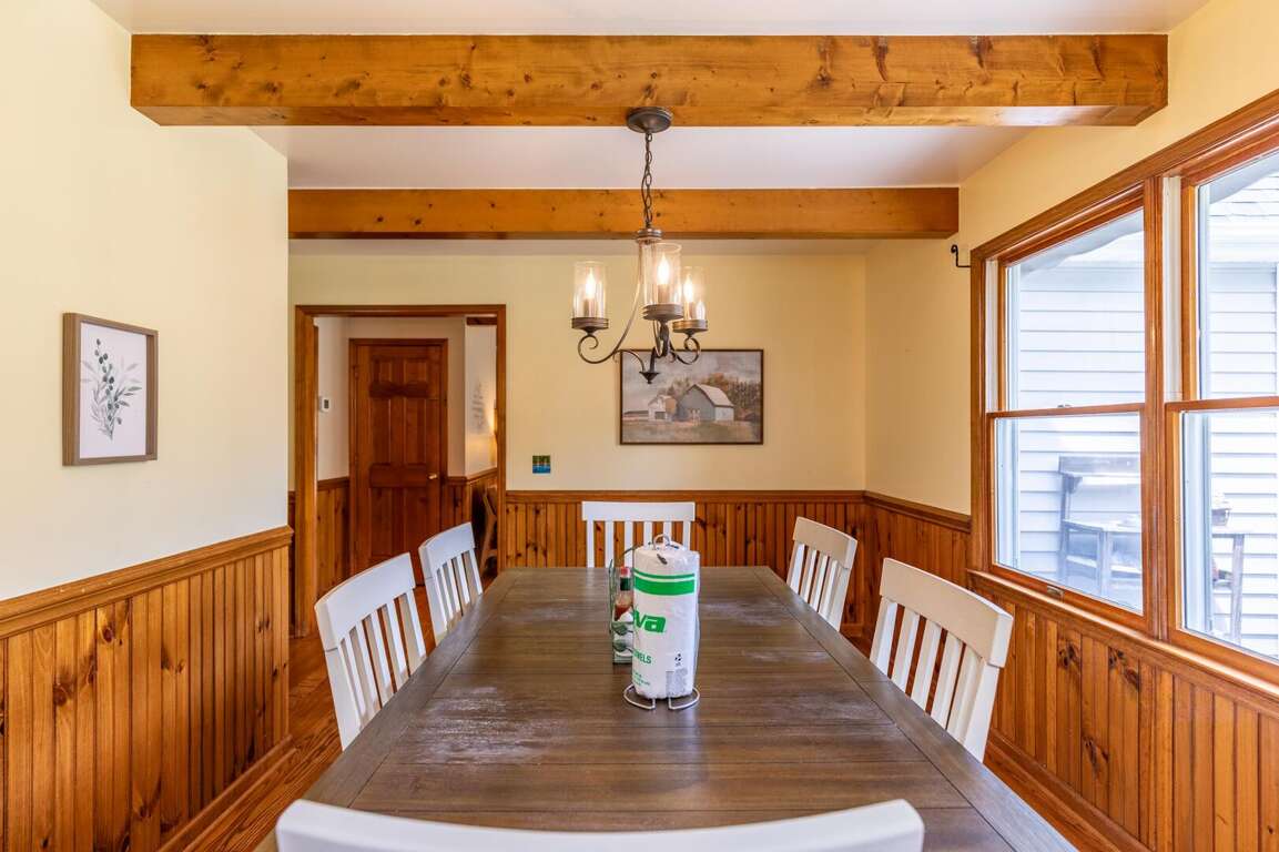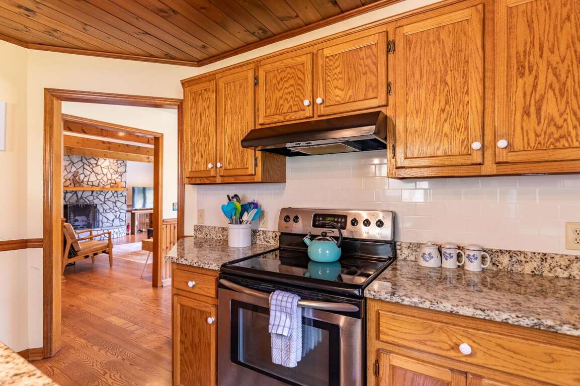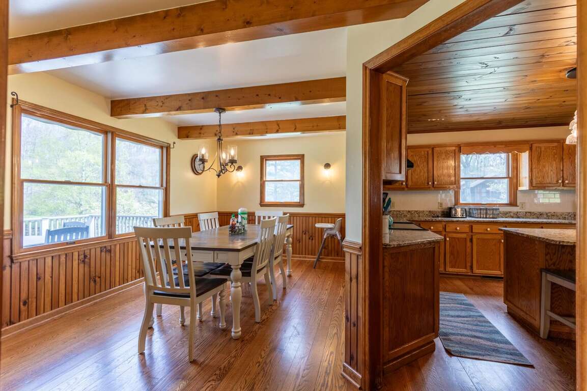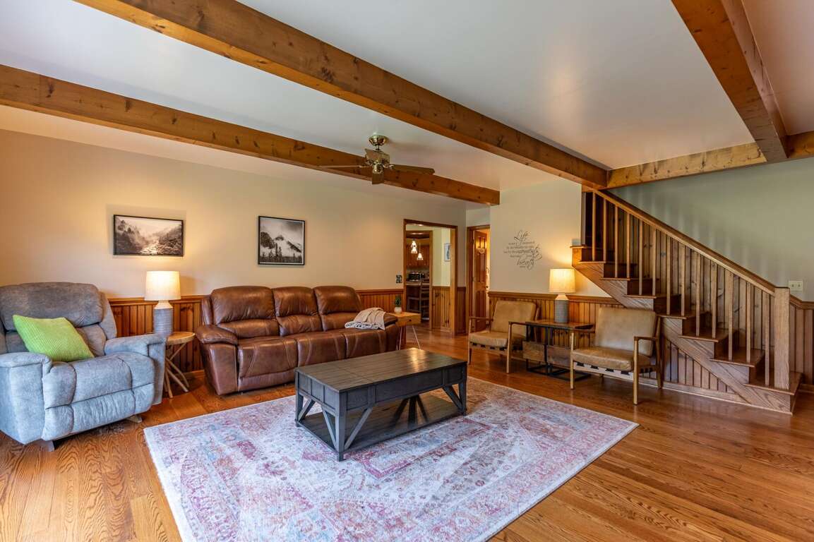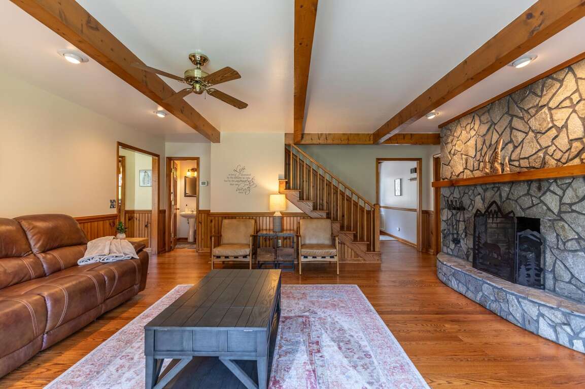 The heart of the home is the expansive living room, featuring a gorgeous stone fireplace and comfortable seating arranged around it to enjoy the warmth of the gas logs or gather to watch TV. The well-appointed kitchen is stocked with all the essentials and offers ample counter space, making meal preparation a breeze. The adjacent dining room comfortably seats six, with additional seating for four just off the kitchen. A convenient half bath is located nearby for ease of access.<br />