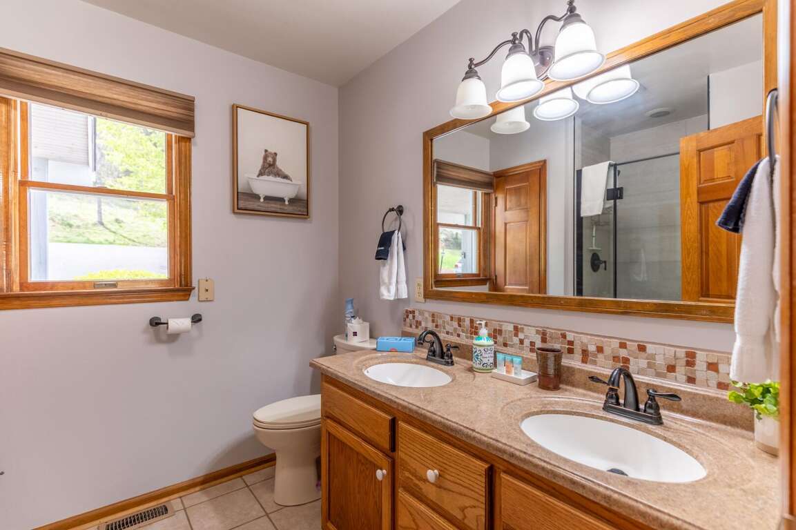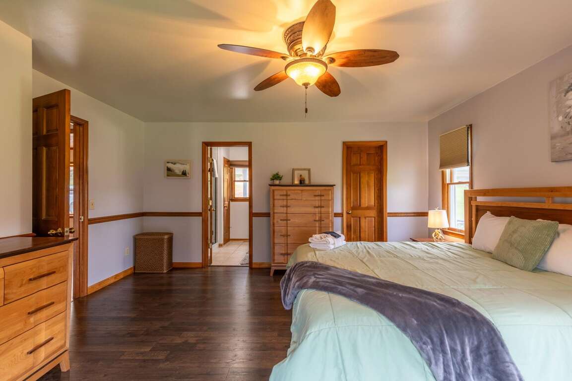 The main level also features a serene primary suite, offering a king-sized bed, a ceiling fan, and a large flat-screen TV. This spacious retreat includes an ensuite bathroom with double vanities and a custom-tiled shower, providing a spa-like experience in the comfort of your own space.<br />