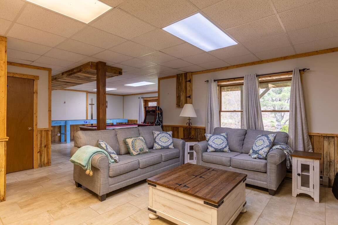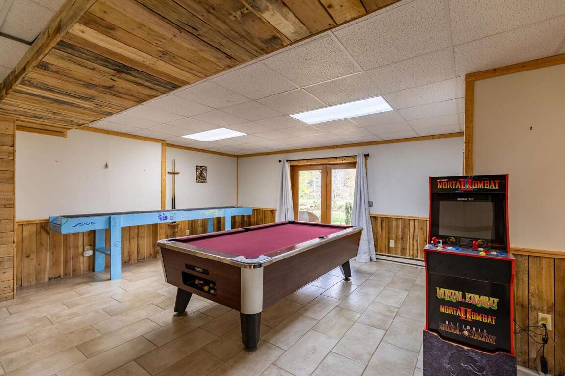 The expansive lower level serves as a true entertainment hub. The game room offers a carpet ball table, pool table, arcade cabinet, and giant Jenga set. A large TV and custom bar make this space perfect for both relaxation and fun. For additional sleeping, the couch pulls out to a queen sleeper sofa, with a half bath for conveniently located nearby.<br />
