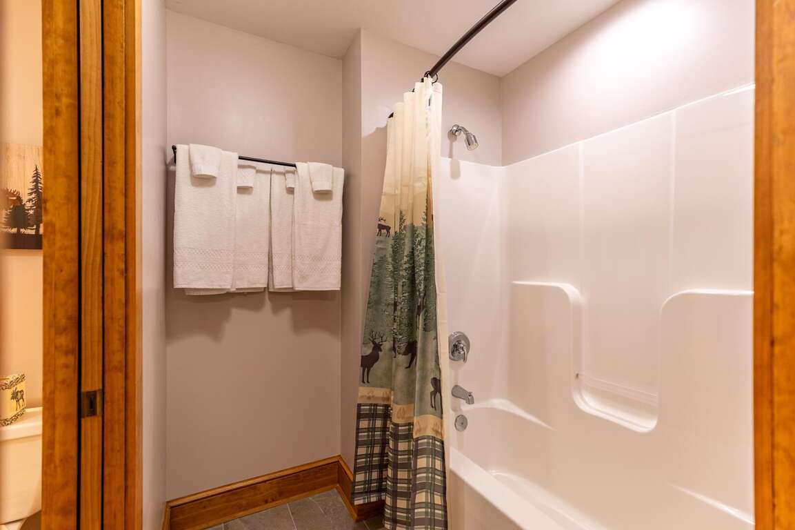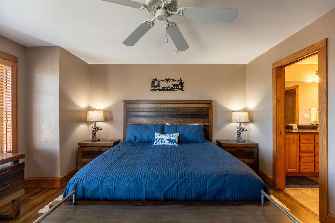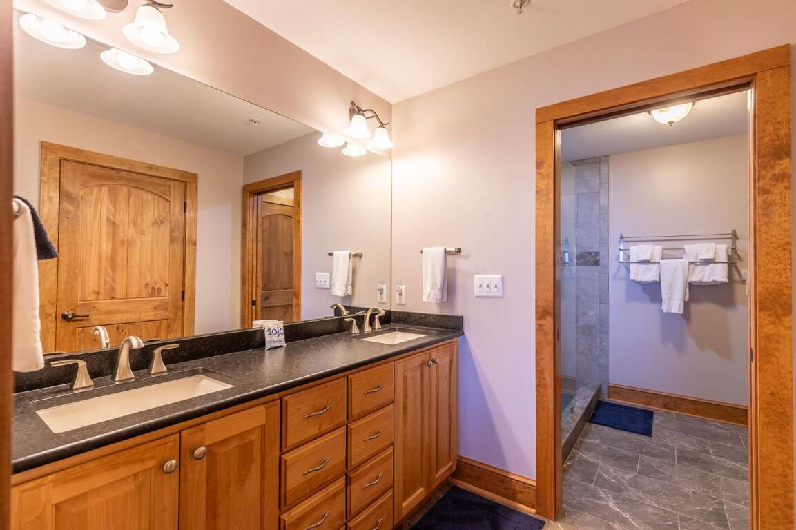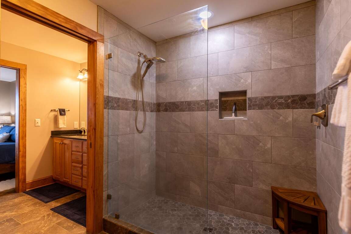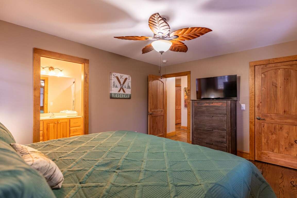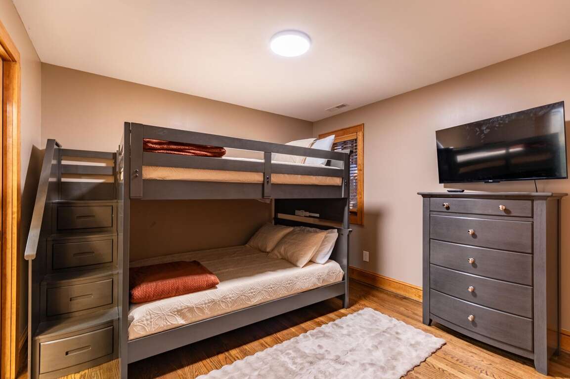 All three bedrooms are designed with rest and privacy in mind, each featuring its own private TV and bathroom. The luxurious primary suite includes a king bed, dedicated workspace, private deck access, and a spa-like ensuite with a custom tiled shower and double granite vanity. The second suite also offers a plush king bed and a private ensuite bath, this one with a shower/tub combo. The third bedroom is ideal for families, with a full-over-full bunk bed and an ensuite bathroom with shared hallway access, also featuring a tub/shower combo.<br />
