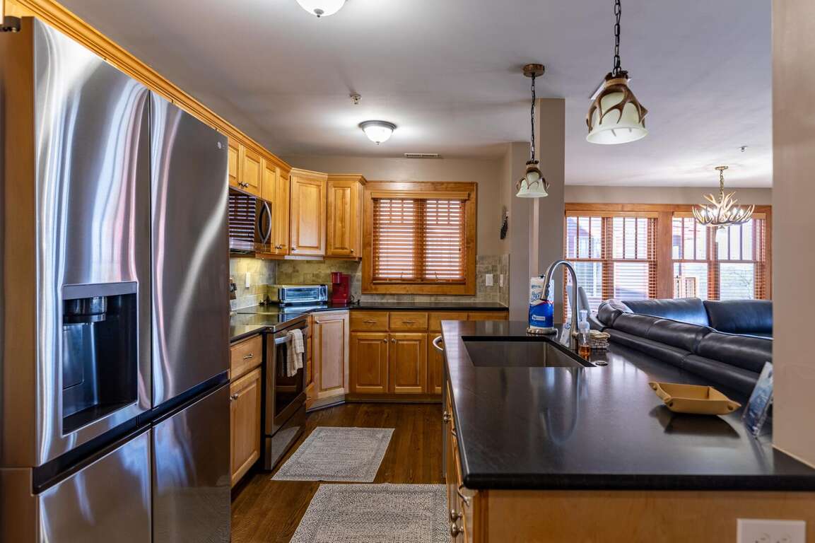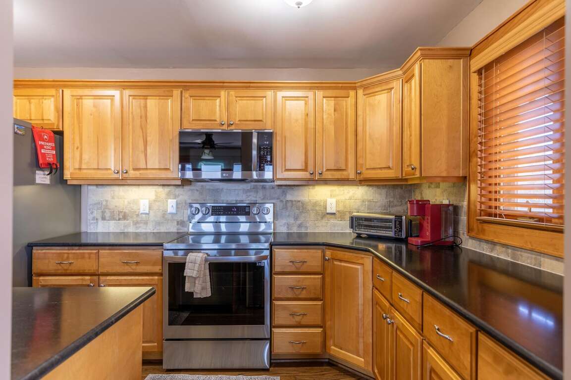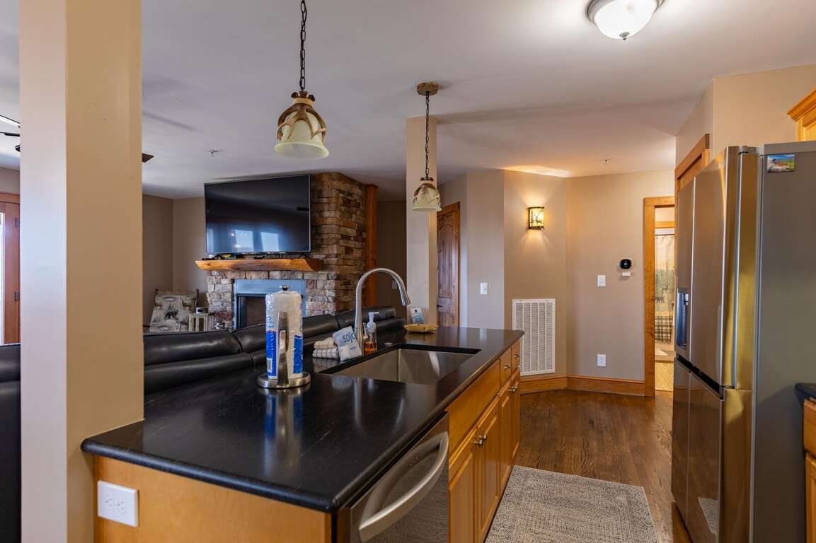 The living room invites you to relax in style with a large leather sectional, gas log fireplace, and a big-screen TV—all set against a backdrop of expansive mountain views. Open the doors to the deck, where you can sip your coffee, breathe in the fresh mountain air, and soak in the vibrant view.<br />