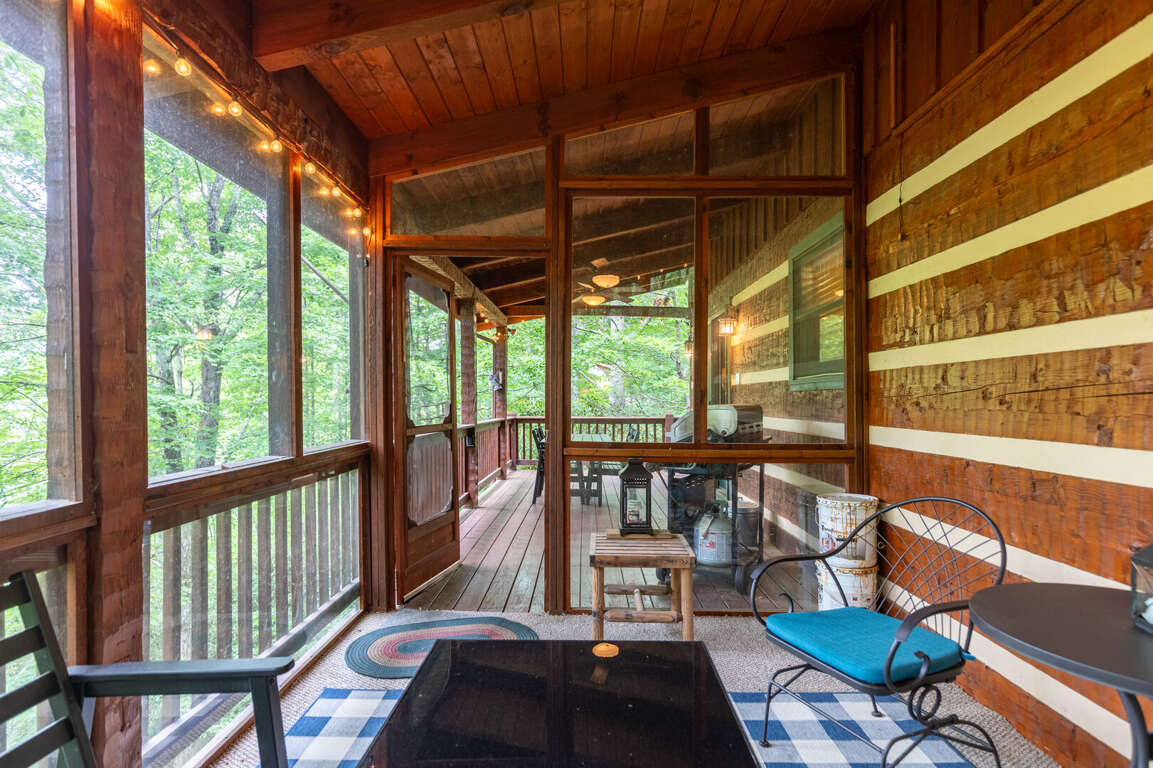 <li>Easy access to the <strong>main-level deck</strong>, where you’ll find <strong>polywood dining table</strong> that seats 6. Additional seating inside a <strong>glass-enclosed porch</strong> to enjoy crystal clear views & protection from the elements. It’s also where everyone will soon be found swinging in their favorite <strong>egg chair</strong>. Other extras…a cozy propane tank <strong>fire table</strong>, exterior decorative lighting, and a gas grill. All make for perfect days and nights gathering & relaxing outdoors.</li>