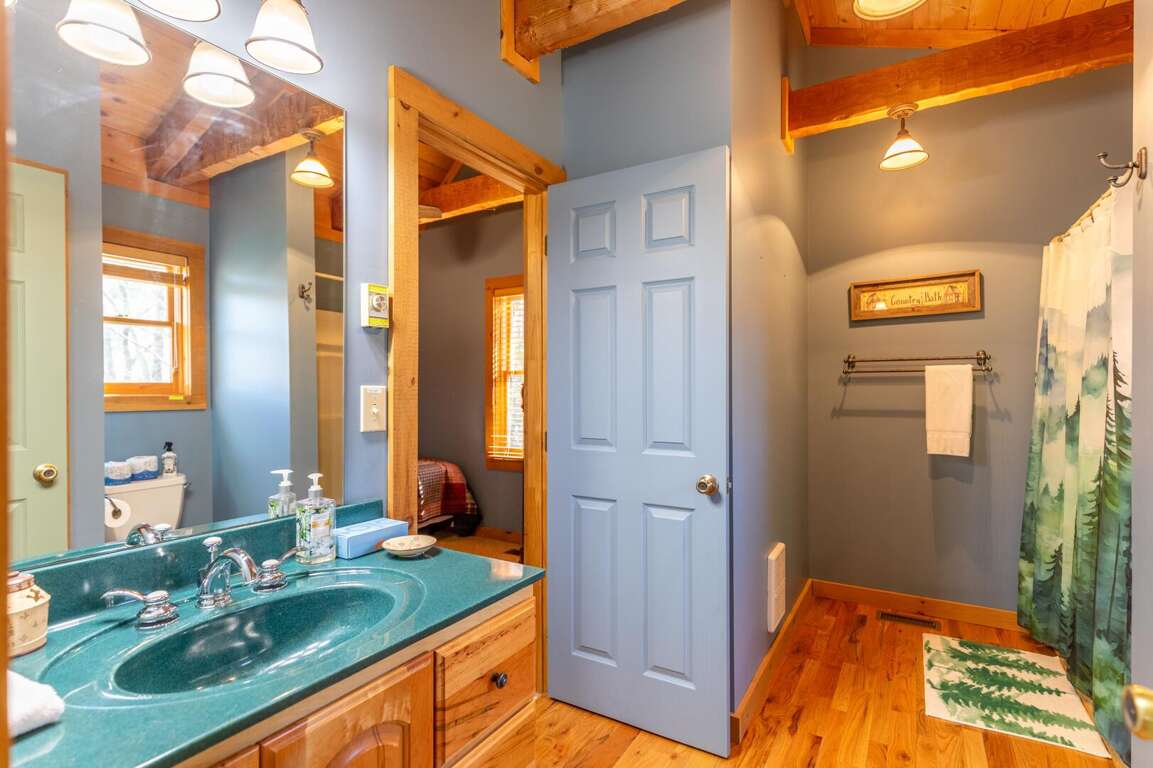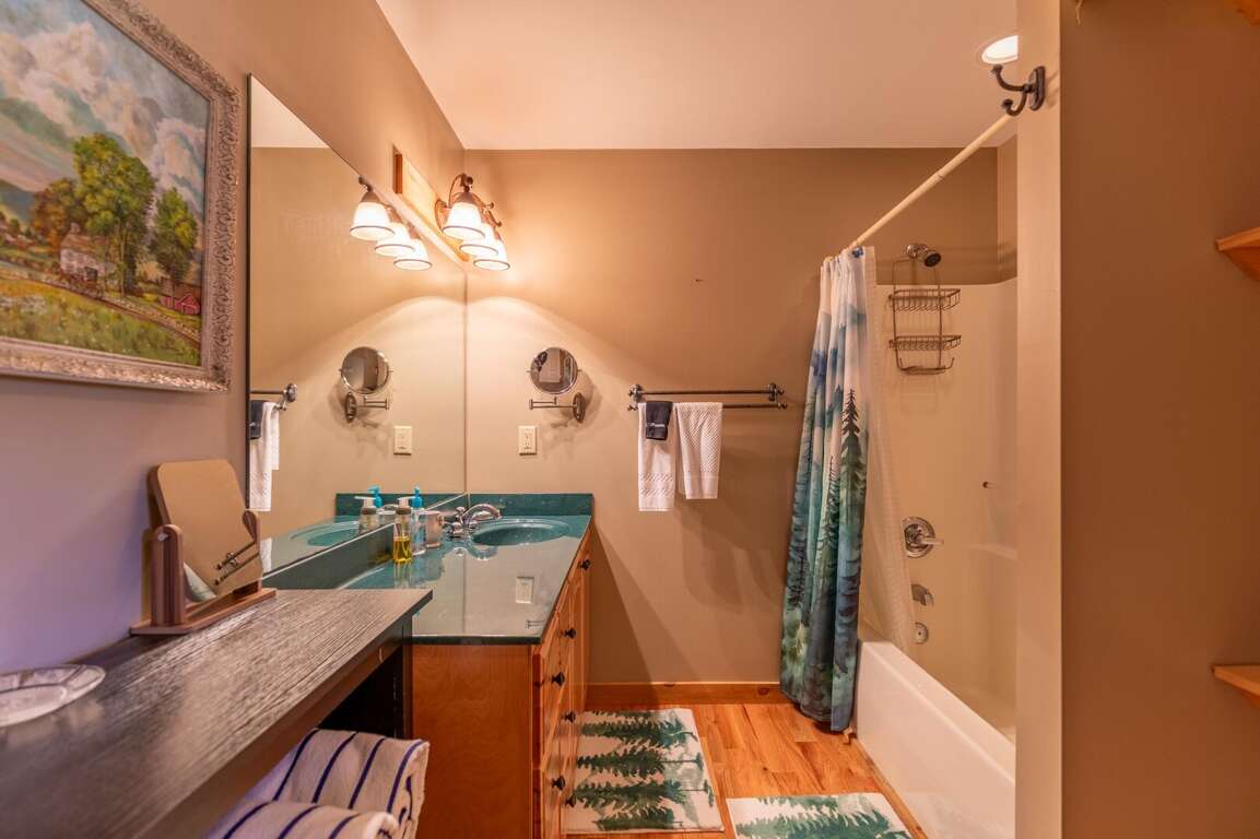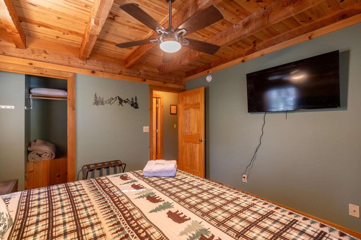 <li>The “<strong>Mountaintop Master” Suite</strong>, also on the main floor! It has a <strong>King Bed</strong>, smart TV, ceiling fan, walk-in closet, and an extra-spacious bathroom. The abundant shelving is perfect for those who have lots to spread out and if not, the cleaning crew does supply some starter size supplies for the more minimalists. The master bath features a double vanity, seated makeup area, sliding-door shower. The exposed beams give authentic mountain charm. For added convenience this bath connects to the hallway for other main floor bathroom access. </li>