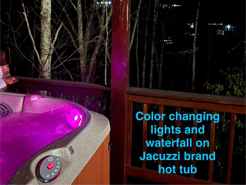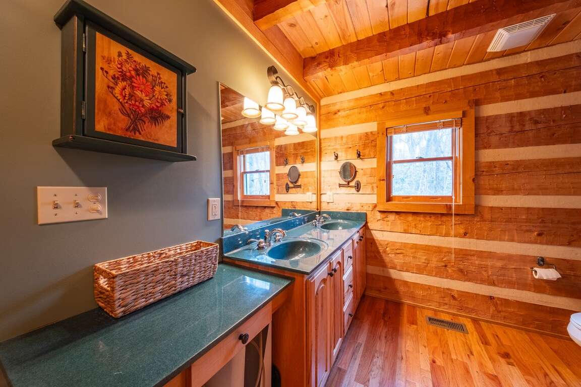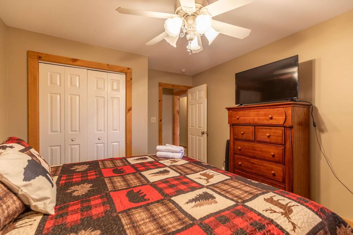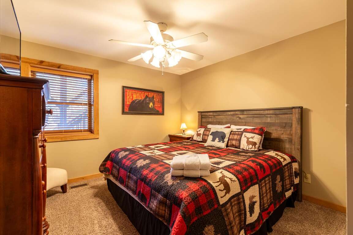 The lower level has two more bedrooms— <strong>“Red Bear Room”</strong> the 2nd <strong>King Bed</strong> Room and <strong>“Woodland Creatures Room”</strong> <strong>Queen Bed</strong>—each with their own smart TVs, ceiling fans and <strong>space heaters</strong>. These share a spacious bathroom with a <strong>double vanity</strong>, tub/shower combo, and plenty of shelves for everyone to spread out their toiletries. This level opens onto a second outdoor covered deck with a 7-person <strong>Jacuzzi® hot tub</strong>, complete with <strong>waterfall and colored lights</strong>. Just inside, you’ll find a wall mounted towel warmer—perfect for warming up post-soak. The towel warmer is really quite a treat. Lots of extra towel hooks have been strategically placed in the lower level bathroom to accommodate all the post hot tub towel drying needs. The laundry room is also on this level with a <strong>full size washer and dryer</strong> to fluff and dry towels or your personal items as desired. <br />