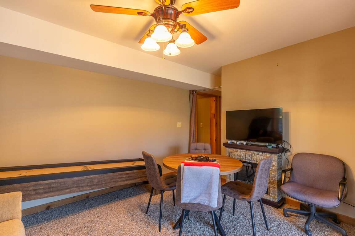 The <strong>second game room</strong> is on this lower level too. Having 2 game rooms is helpful when accommodating different age groups of adults or children. It provides lots of opportunities for people to spread out. This <strong>“Game Zone”</strong> room includes a smart TV with <strong>Xbox and 2 controllers</strong>, a <strong>color changing fireplace</strong> space heater, ceiling fan, <strong>9-ft Skee-Ball arcade game</strong>, board games galore, and a round table for cards, puzzles, poker, etc. At night, the sleeper sofa transforms the space into a 5th sleeping area—ideal for kids or teens. The black out curtains at the hallway & slider door close for privacy.<br />