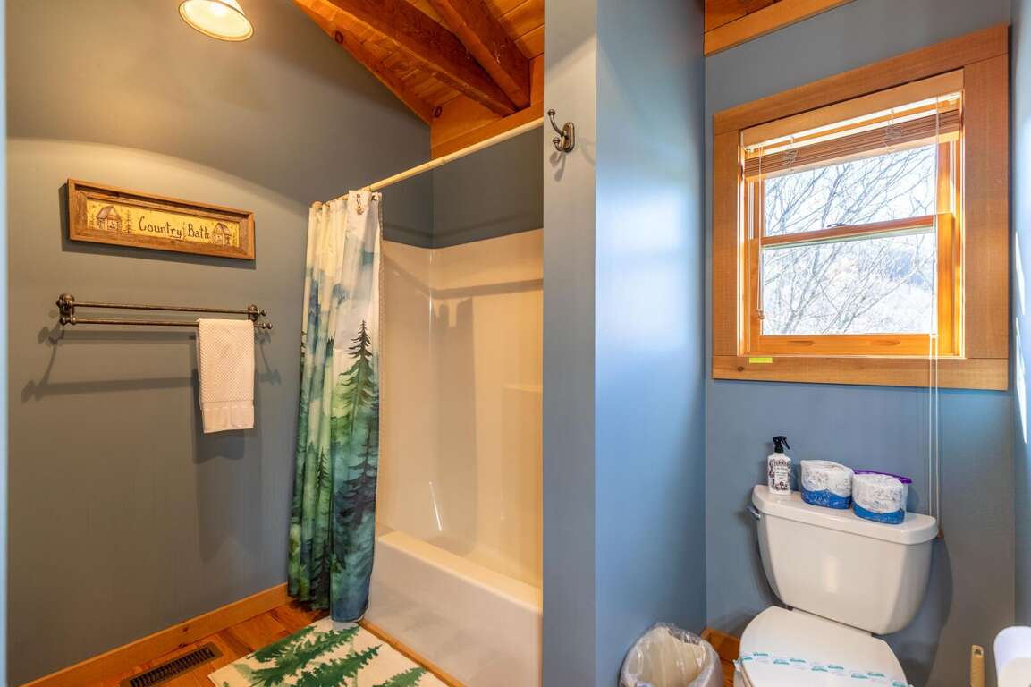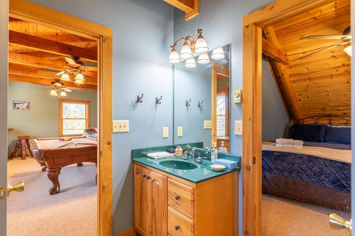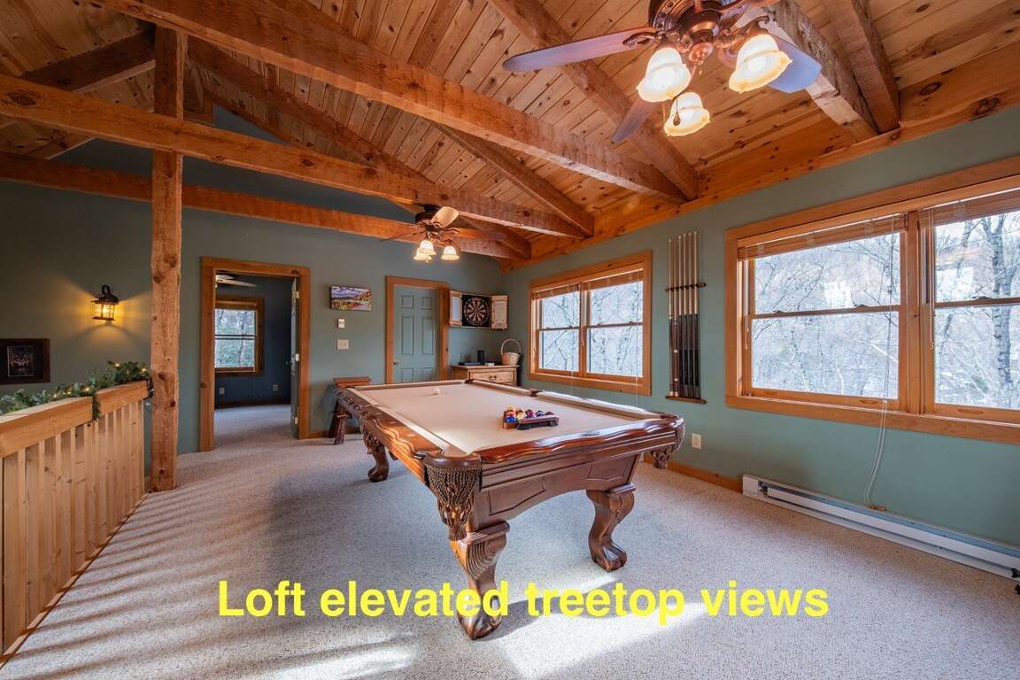 Upstairs, the <strong>Loft Game Room</strong> includes a <strong>billiards table</strong>, <strong>dartboard</strong>, spectacular <strong>vaulted beamed ceilings</strong>, bright <strong>skylights</strong>, ceiling fans, bar stools and a full wall of windows showcasing the treetops and seasonal hillside views. The separate loft bedroom, the <strong>“Blue Ridge Sky Room”</strong>, offers a <strong>Queen bed</strong>, <strong>Twin bed</strong>, smart TV, ceiling fan and even a <strong>seasonal view of Grandfather Mountain</strong>. The ensuite has a shower/tub combo, granite vanity and a floorboard heating system. The bath connects to the billiard room for convenient upstairs bathroom access.<br />