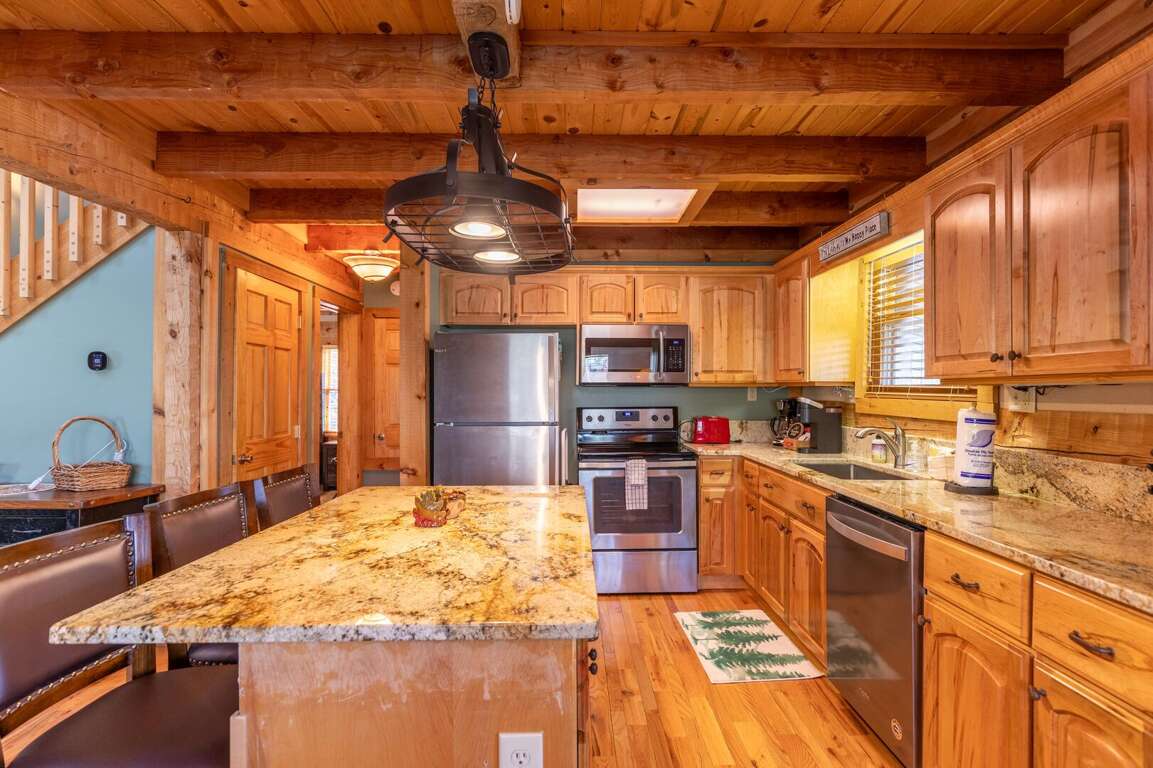What makes this property truly unique is its <strong>no-stairs entry</strong>—That’s a rare find in the mountains. From the level 4 car driveway, you walk effortlessly onto a spacious, covered front porch with an assortment of rocking chairs. The ease of access makes even unloading luggage and groceries a comfortable start to your mountain life getaway. Realizing guests come to the area to enjoy an abundance of outdoor activities, we’ve taken special care to provide a boot cleaning bench at the front door for all your post hiking/skiing needs. We are dog friendly, so we know our 4-legged friends love their nature walks too. You will find it comes in quite handy for cleaning paws too. Once you walk through the screened front door, you’re greeted by a wide-open great room with <strong>vaulted beamed ceilings</strong>, a stunning <strong>2-story stone gas fireplace</strong>, and a cozy hearth. The great room includes a 2-recliner sofa and swivel chairs gathered around the gas easy start fireplace and smart TV. The kitchen & dining common areas all connect to the great room. The modern open-concept layout provides lots of flexible seating options for gathering even larger groups. <br />