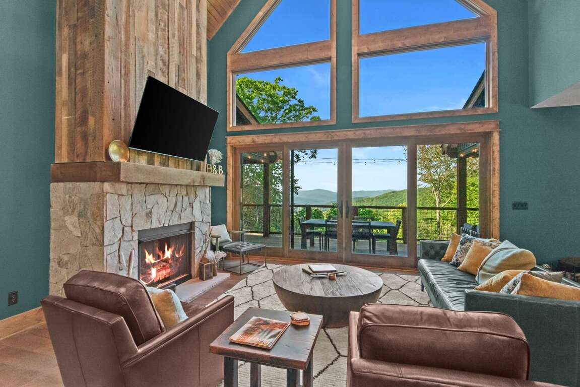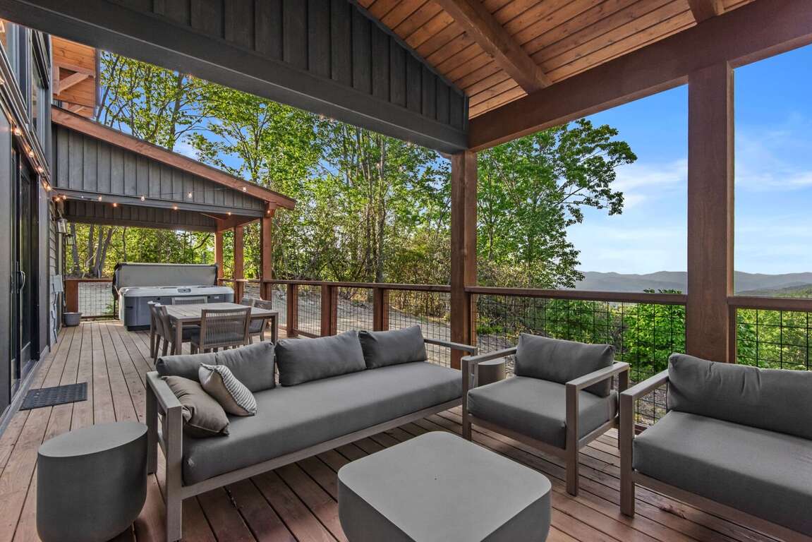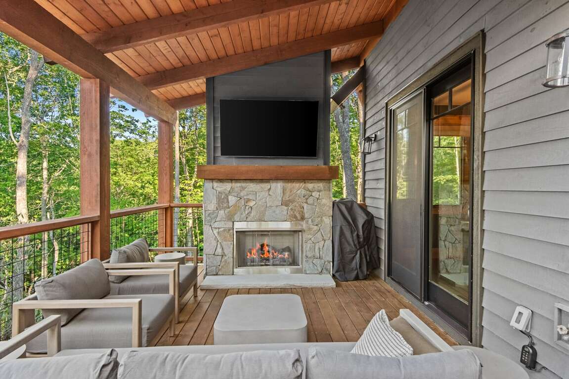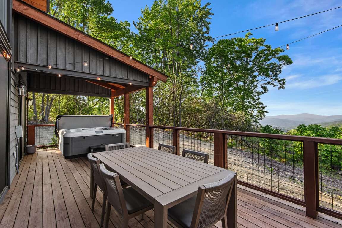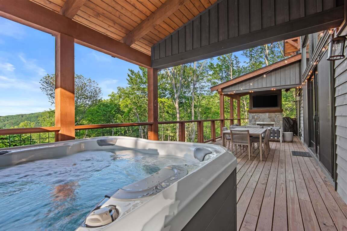 <strong>Hot-tub bliss + mountain magic:</strong> Spend evenings in your 6-person hot tub or lounge on the spacious, partially covered deck, soaking in sweeping mountain views, the soothing sound of nearby creeks, and fiery sunset hues. The deck also features a cozy gas fireplace with a large TV above. Perfect for family movie night! <br />