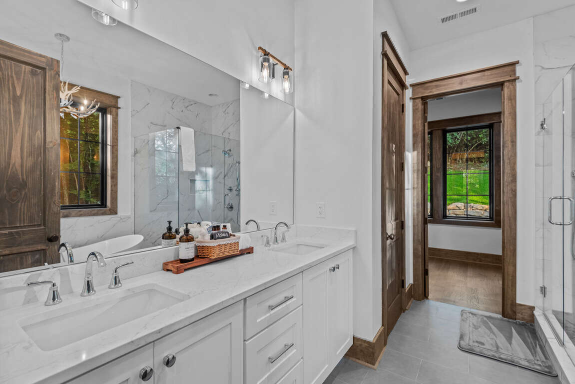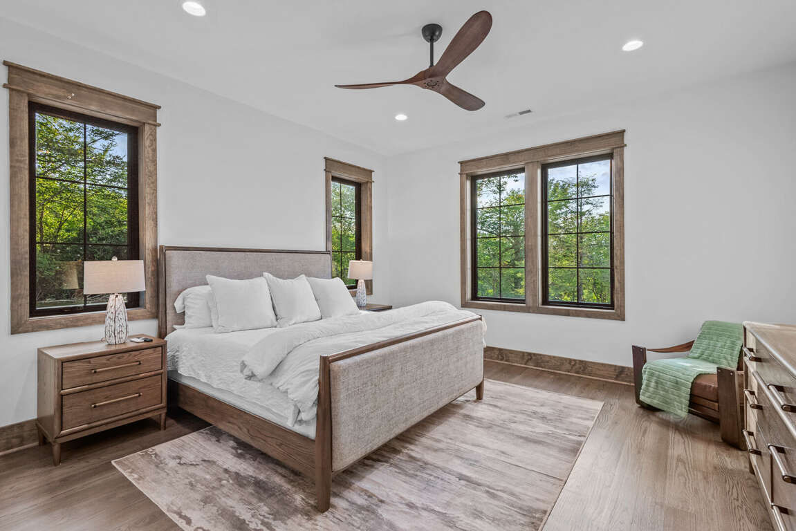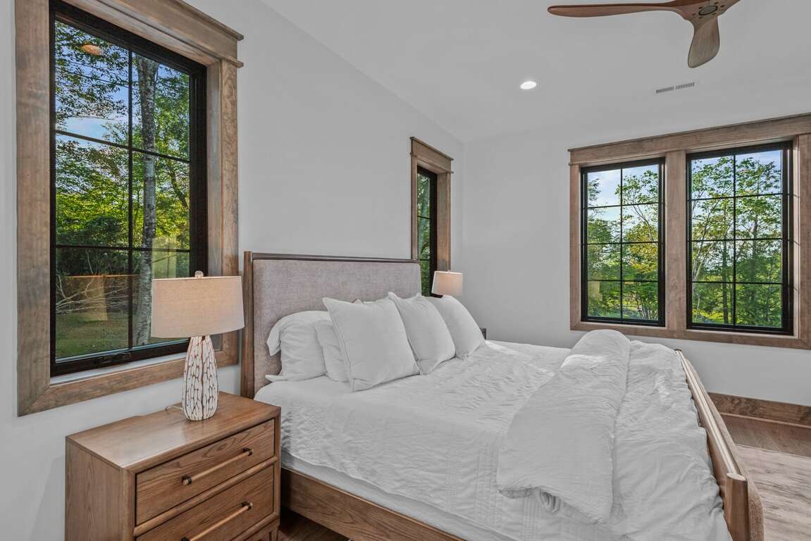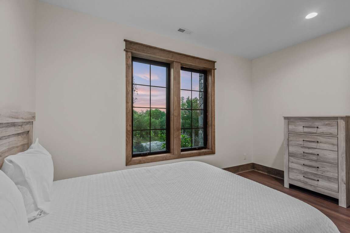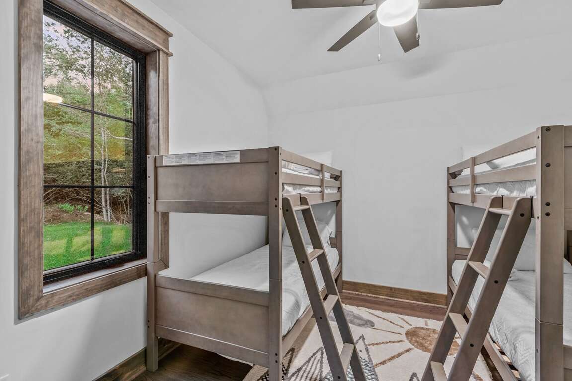 The home’s layout is designed for both comfort and privacy. On the main level, you'll find a luxurious king en suite, offering high-end finishes and convenient access to the main living areas. Upstairs, a queen en suite provides a private retreat, while a second queen bedroom and a bunkroom with two sets of twin-over-twin beds share a spacious full bathroom—perfect for accommodating family or guests. On the lower level, a cozy queen bedroom is located next to a full bath in the hallway, offering easy access and privacy. Each bedroom is carefully appointed to ensure every guest enjoys a restful and relaxing stay.<br />