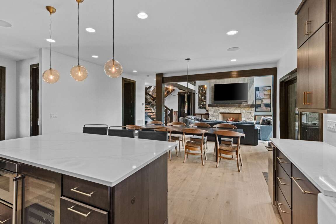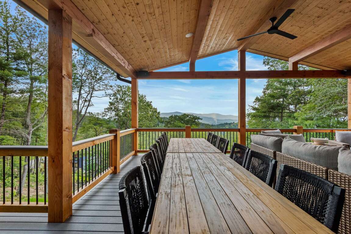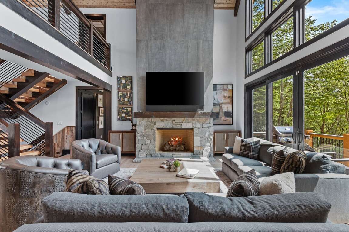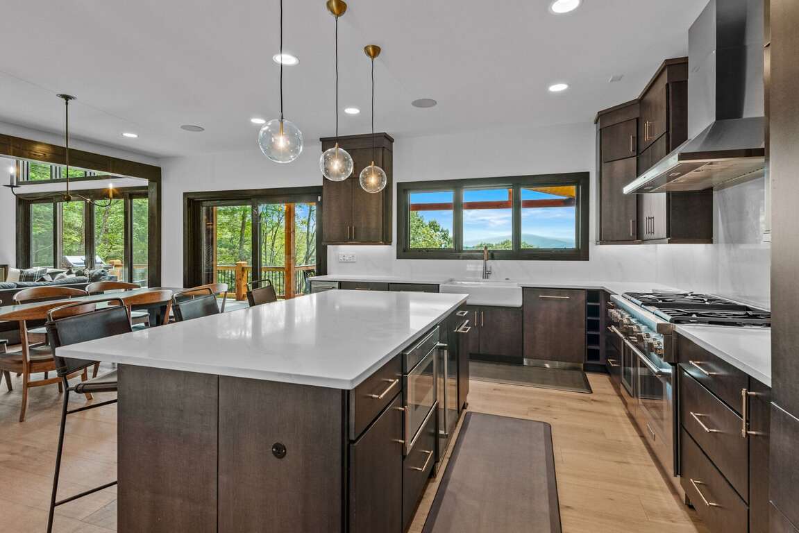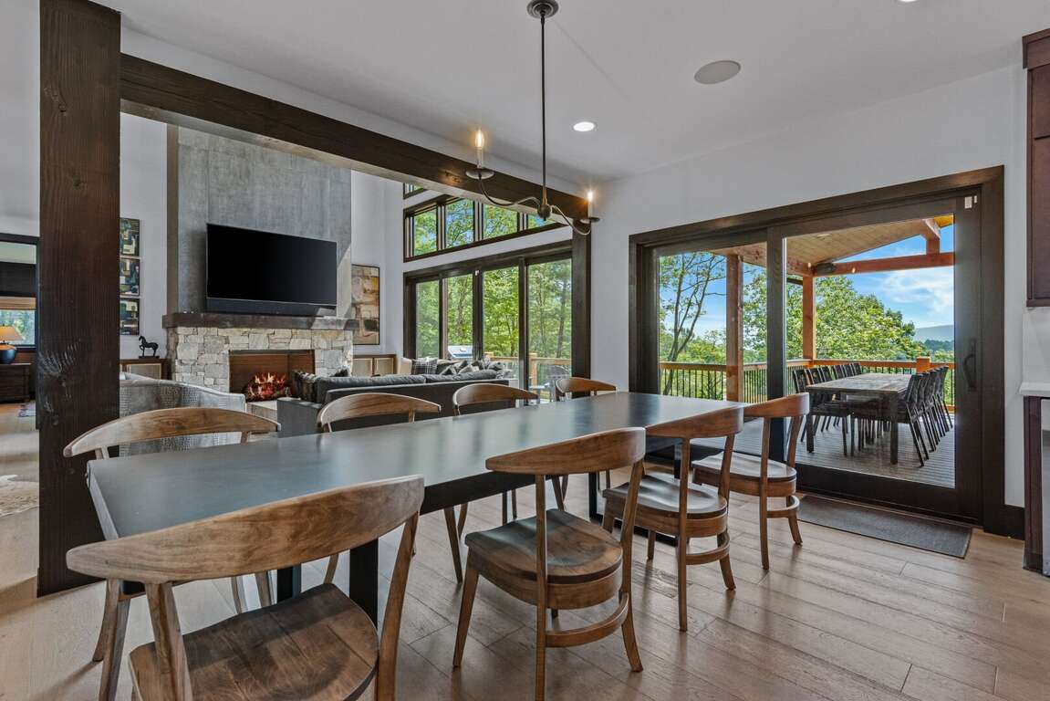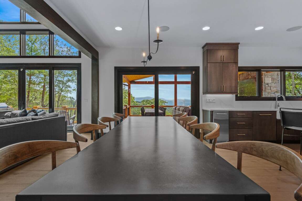 Step inside the open-concept living room, where a wall of windows showcases breathtaking views of the Blue Ridge Mountains. A gas log fireplace and comfortable leather seating invite you to unwind in style. The chef’s kitchen is both beautiful and functional, featuring high-end appliances, two dishwashers, a wine fridge, ice maker, granite counters with abundant workspace, and an island with seating for three. The dining table seats eight or more, making it ideal for group meals and festive gatherings.<br />
