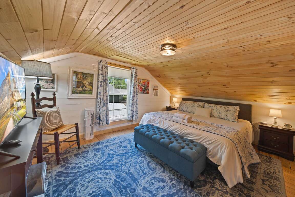 Upstairs, you'll find a third bedroom with a king bed tucked beneath the sloped ceiling, along with another bathroom just down the hall.<br />