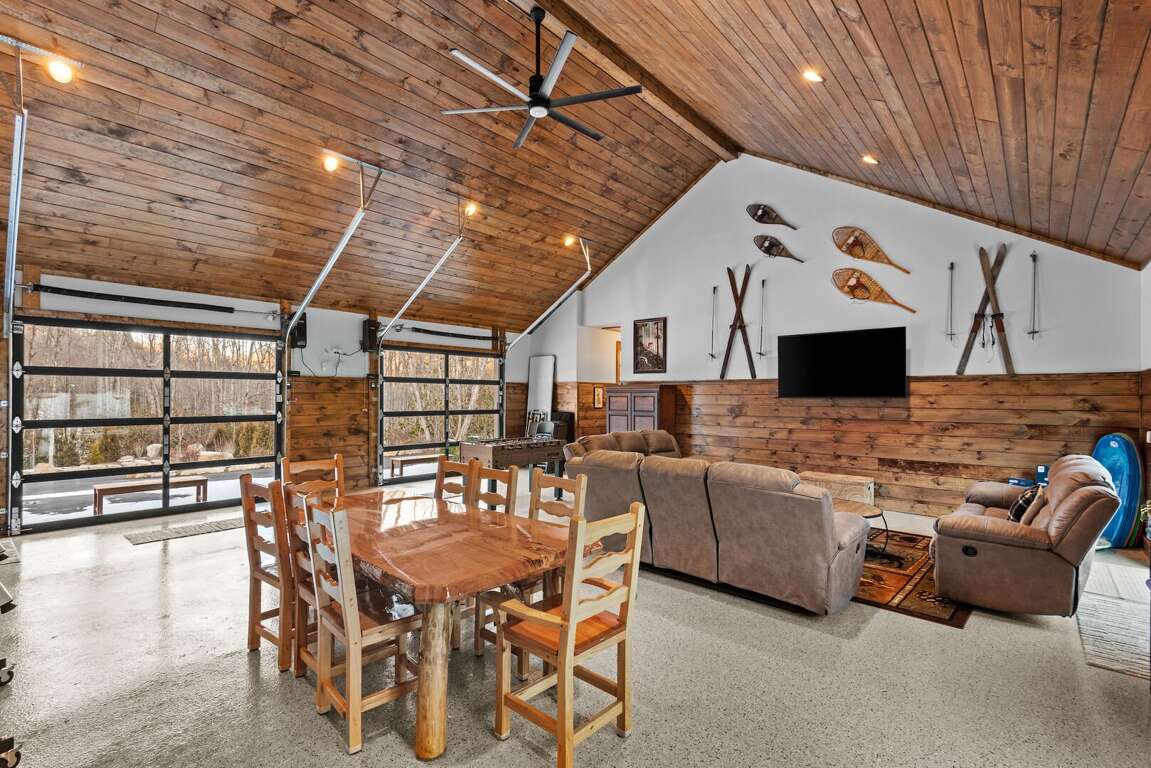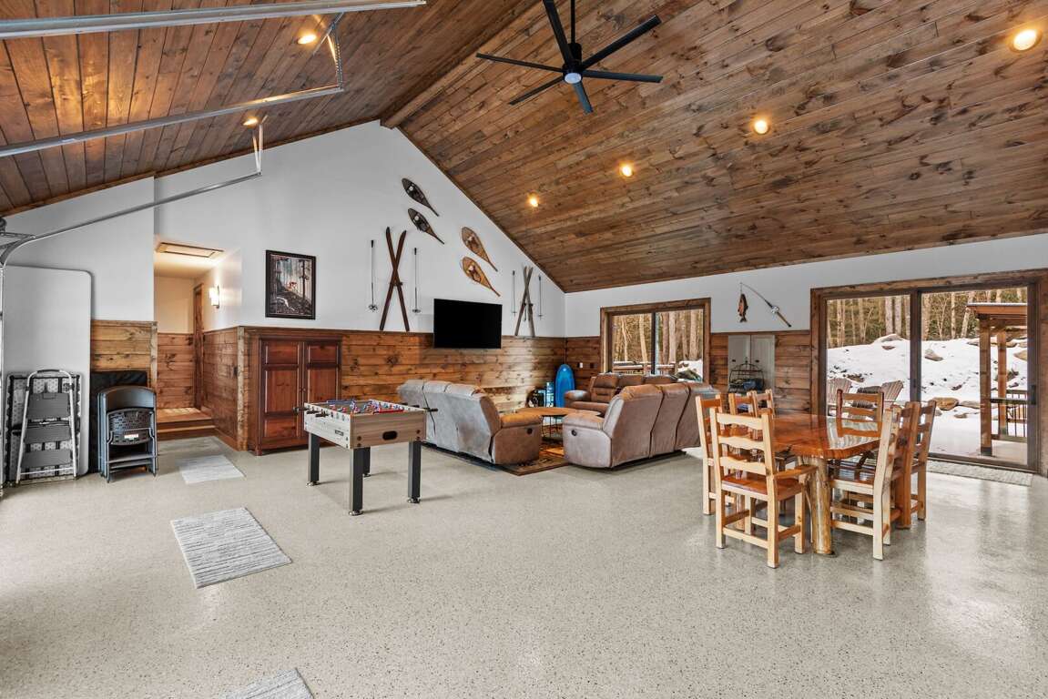 Between Cabins 1 and 2, an expansive indoor gathering area serves as the communal heart of the property. Here, long tables invite group meals, lounge seating encourages lazy afternoons, and game tables complete with ping pong and foosball spark friendly competition. A large screen TV makes it easy to enjoy movies, big games, or evening entertainment, and a collection of board games ensures fun for all ages. It’s a natural meeting point for celebrations, reunions, or casual evenings outdoors. Nearby, Cabin 1 features its own private hot tub, and the property includes two wood burning firepits, perfect for stargazing and s’mores.<br />