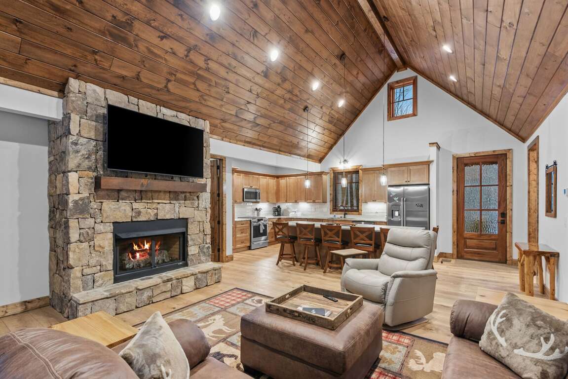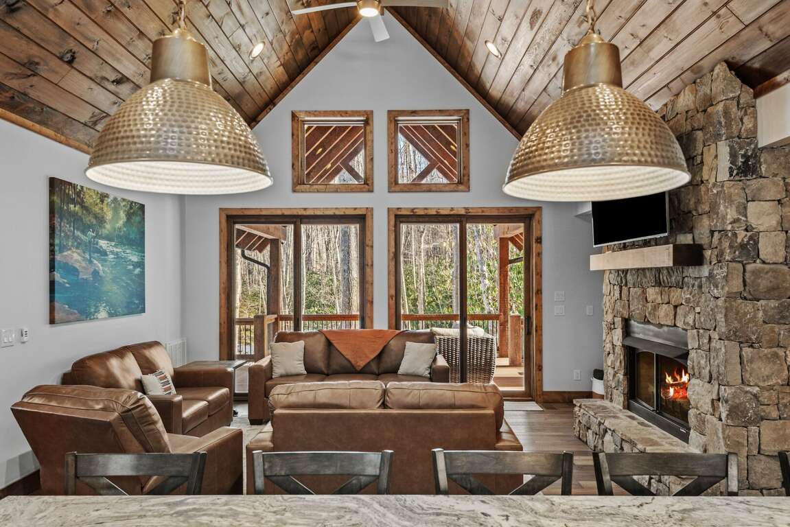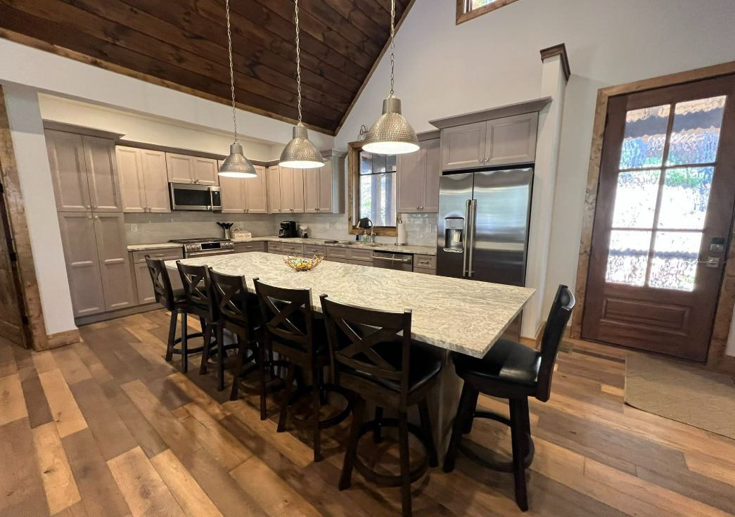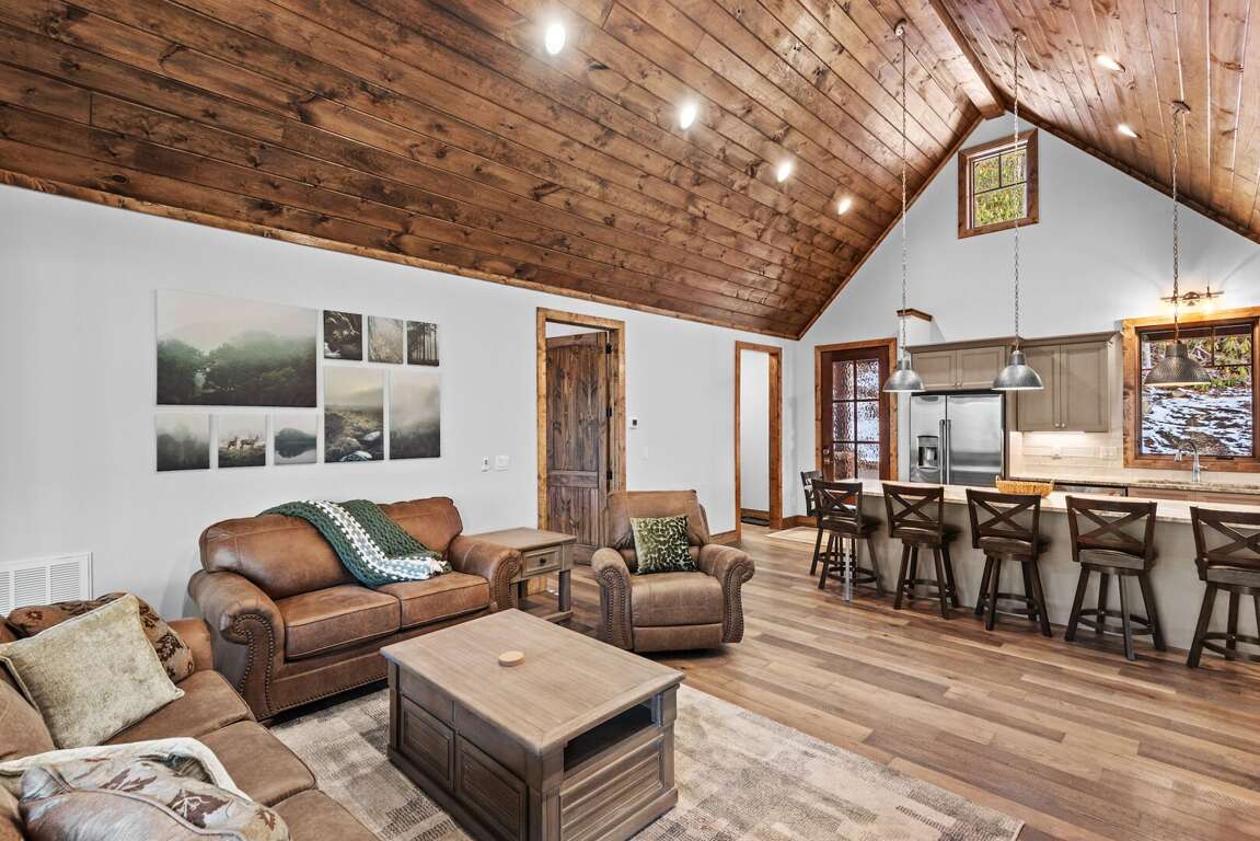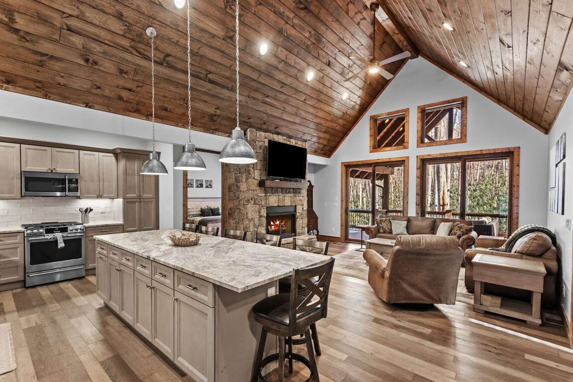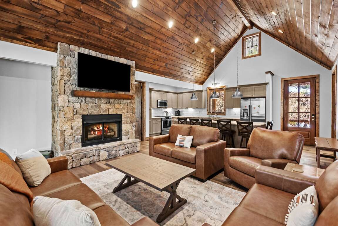 Every cabin is crafted with comfort in mind, offering a warm mountain aesthetic paired with modern conveniences. Open-concept living rooms provide inviting places to unwind, featuring comfortable seating, large smart TVs, and windows that frame the surrounding woods and creek. Each full kitchen includes stainless appliances, ample counter space, and all the essentials for preparing everything from quick breakfasts to shared dinners around the island with seating for 6 at each cabin.<br />