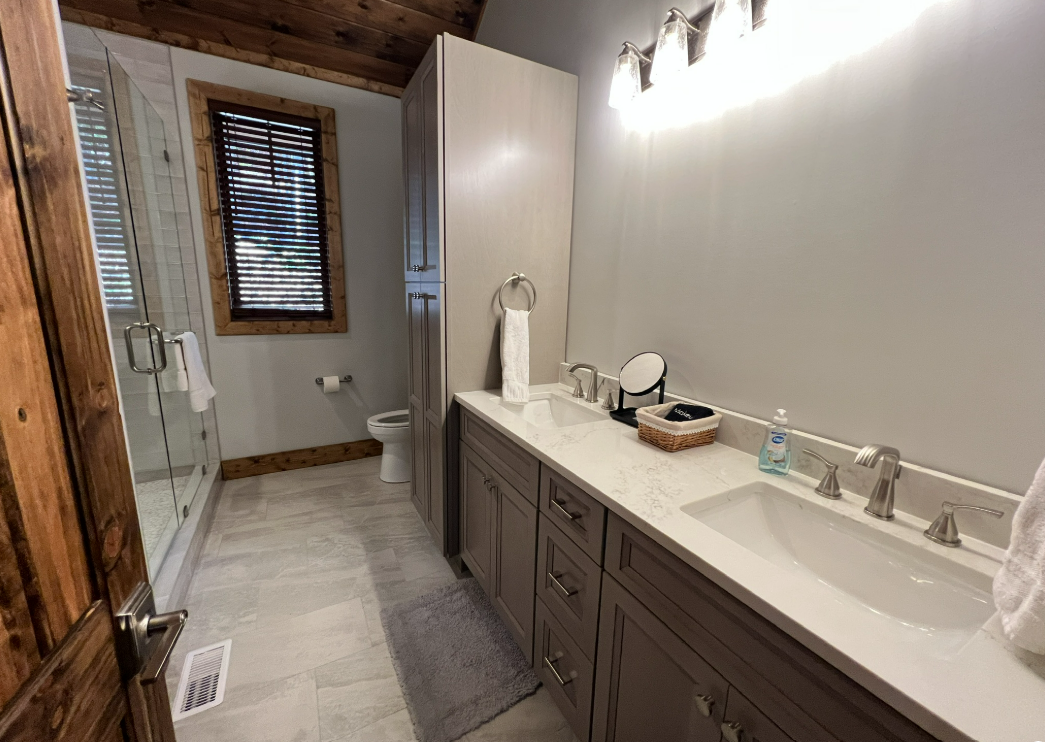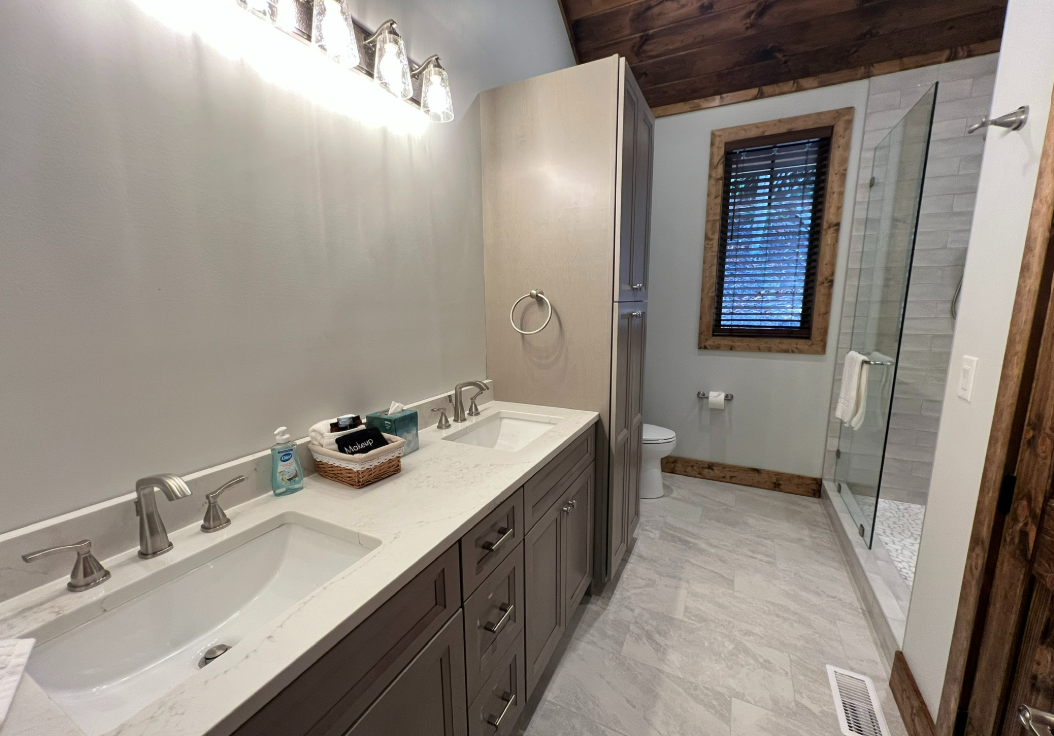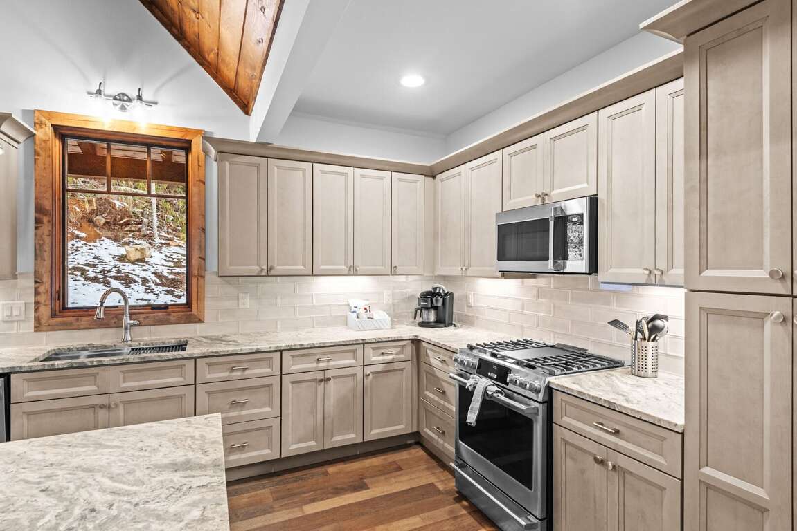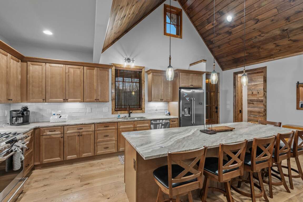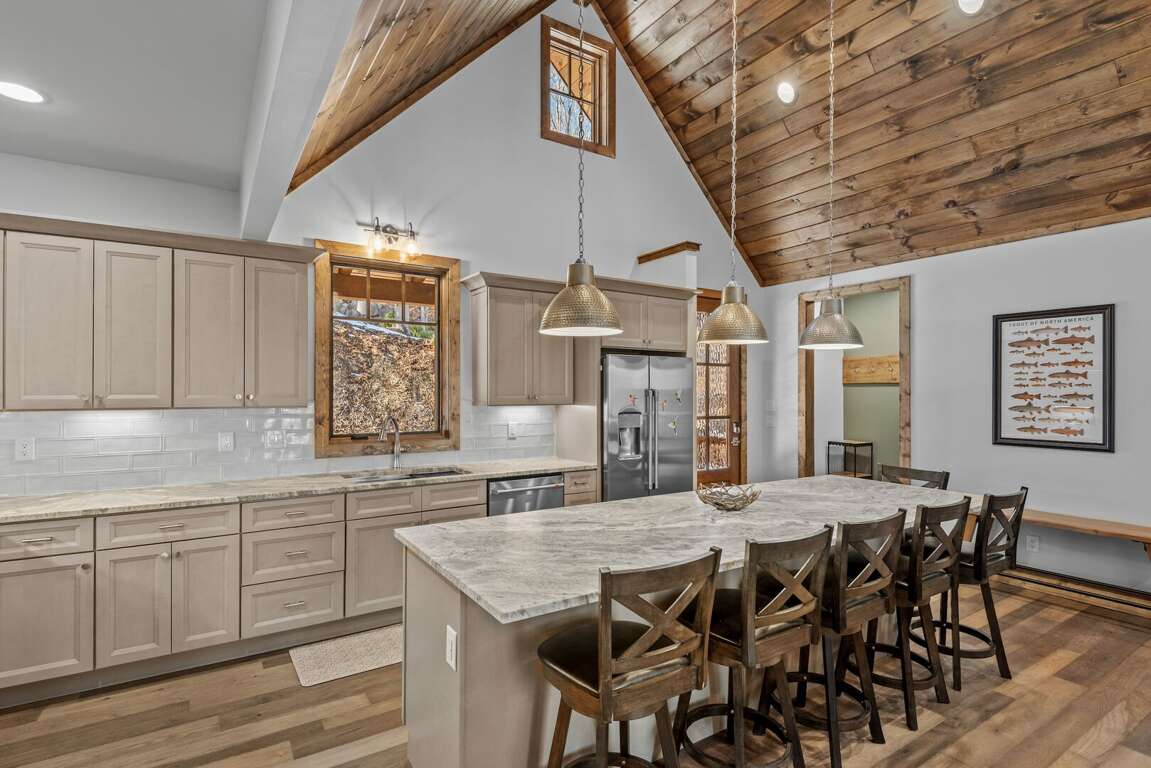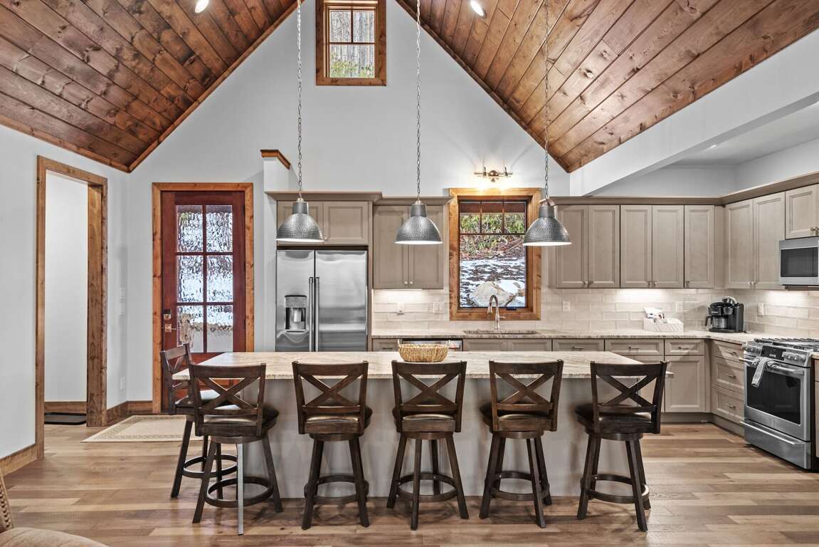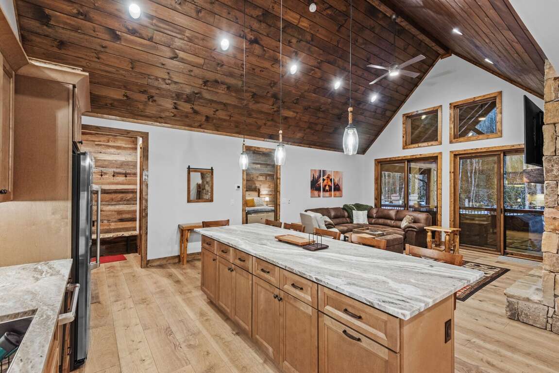 Every cabin is crafted with comfort in mind, offering a warm mountain aesthetic paired with modern conveniences. Open-concept living rooms provide inviting places to unwind, featuring comfortable seating, large smart TVs, and windows that frame the surrounding woods and creek. Each full kitchen includes stainless appliances, ample counter space, and all the essentials for preparing everything from quick breakfasts to shared dinners around the island with seating for 6 at each cabin.<br />