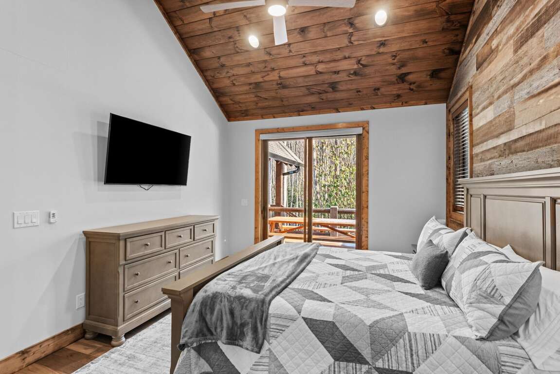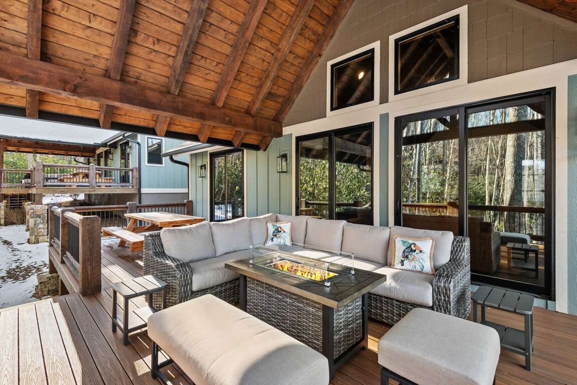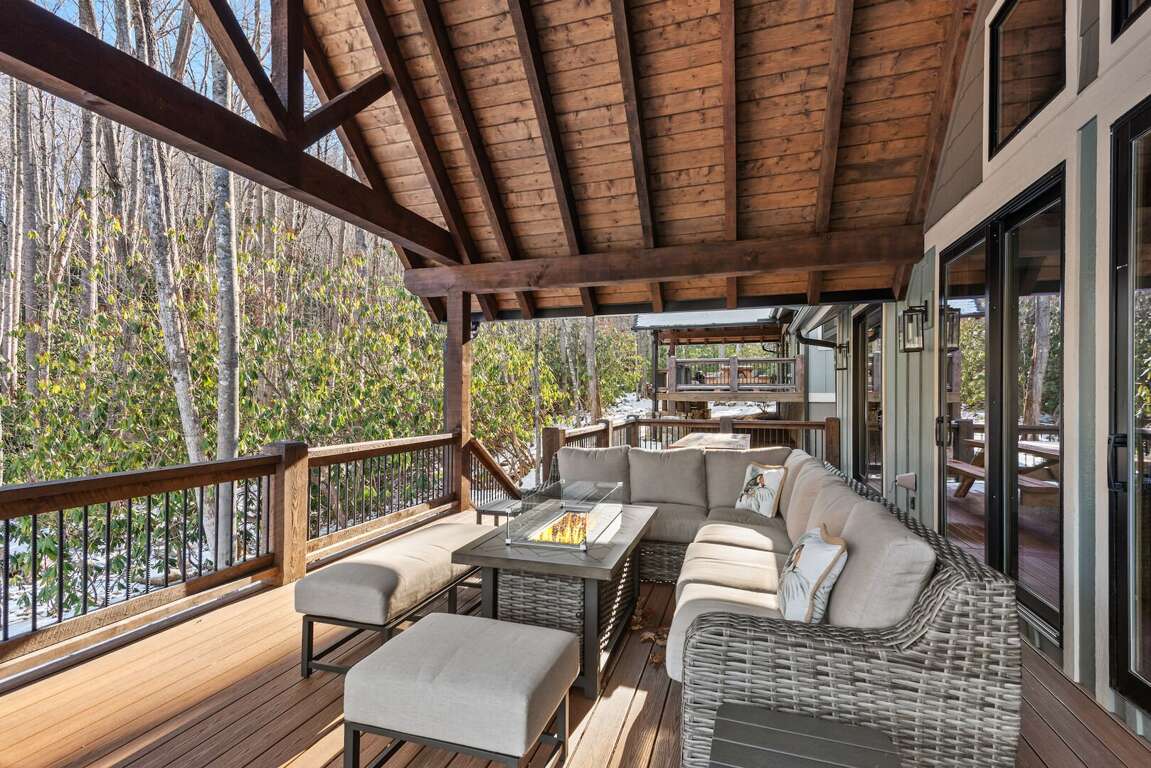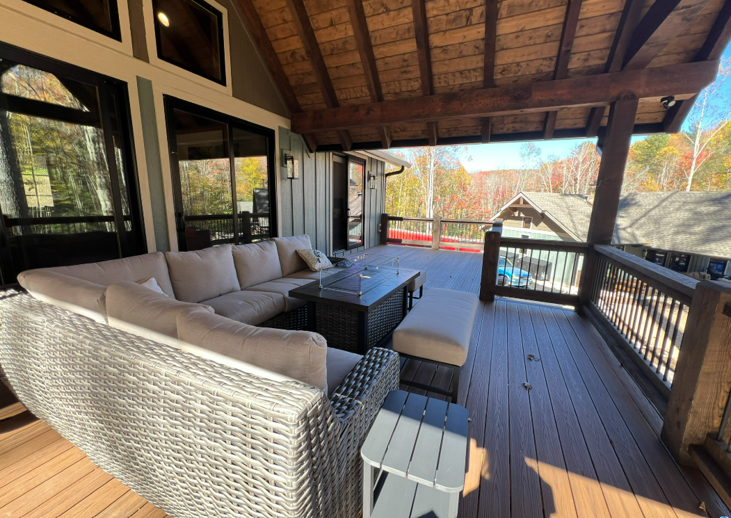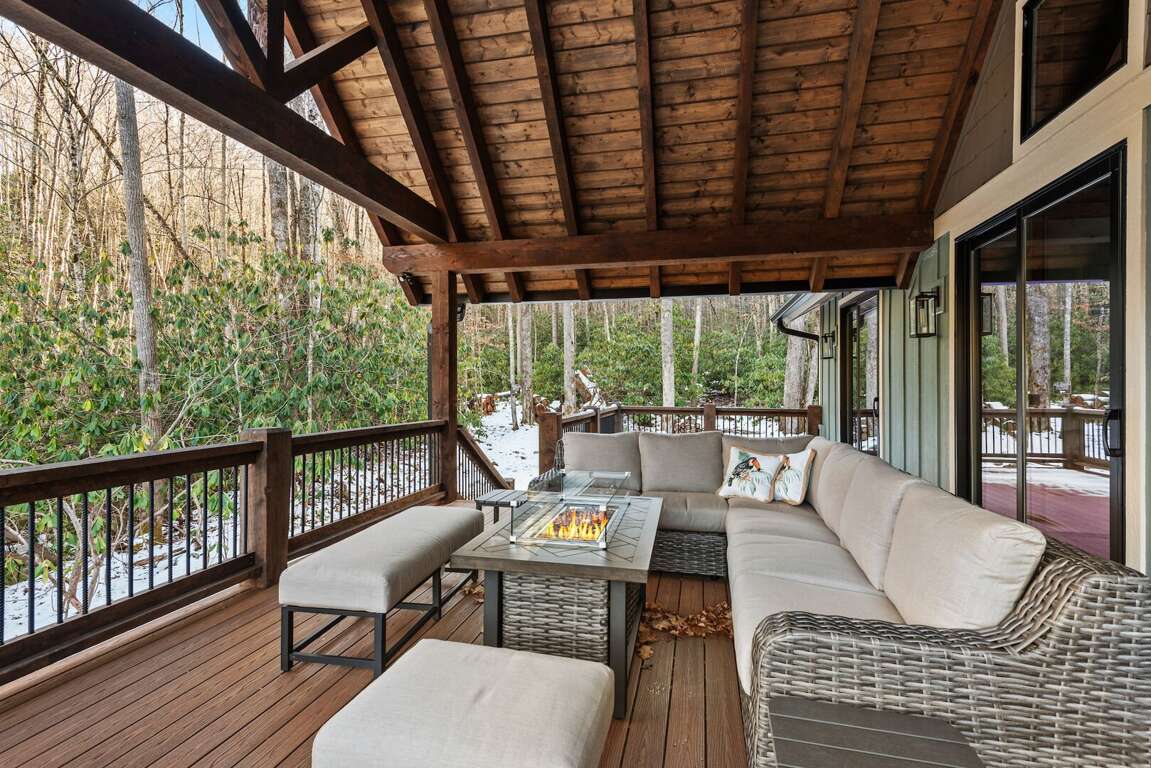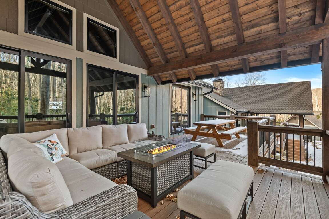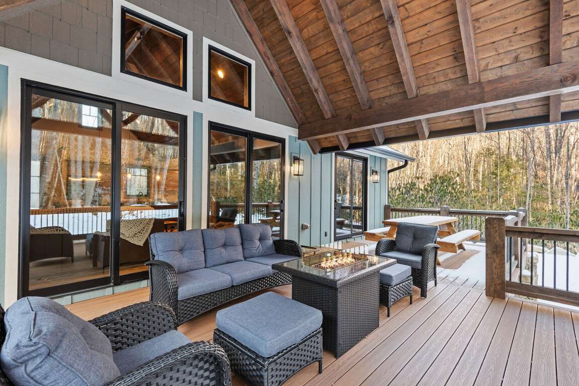 Large private decks extend the living space outdoors, each furnished with a fire table, seating, and dining area so guests can enjoy the mountain air morning to night. And for convenience during longer stays, every cabin includes its own washer and dryer.<br />