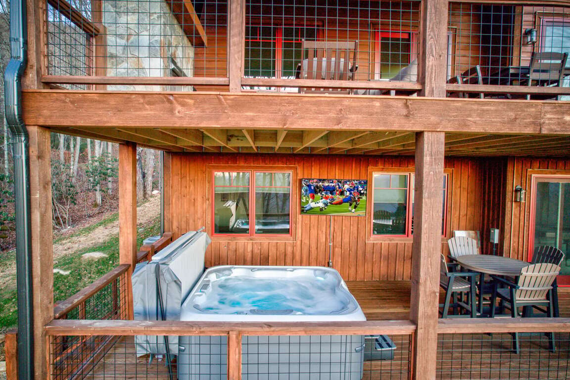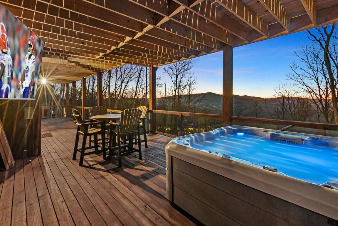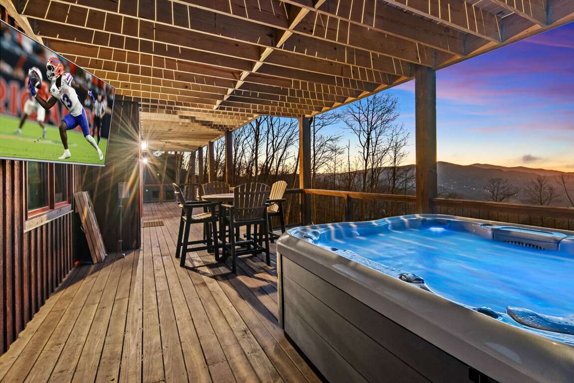 On the lower deck, relaxation reaches a new level as you sink into the steaming hot tub while keeping up with your favorite sports team, enjoy a friendly game of cornhole, or take in a breathtaking sunset as it sets over the ridgeline.<br />