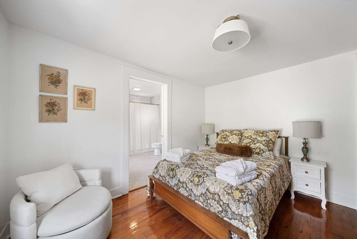 Upstairs, the home continues to unfold its historic charm. A second suite offers a plush queen bed and a private bathroom complete with a granite-topped vanity and shower/tub combo. Besides it, a third suite features a full bed and yet another private bathroom with classic styling and warm granite finishes.<br />