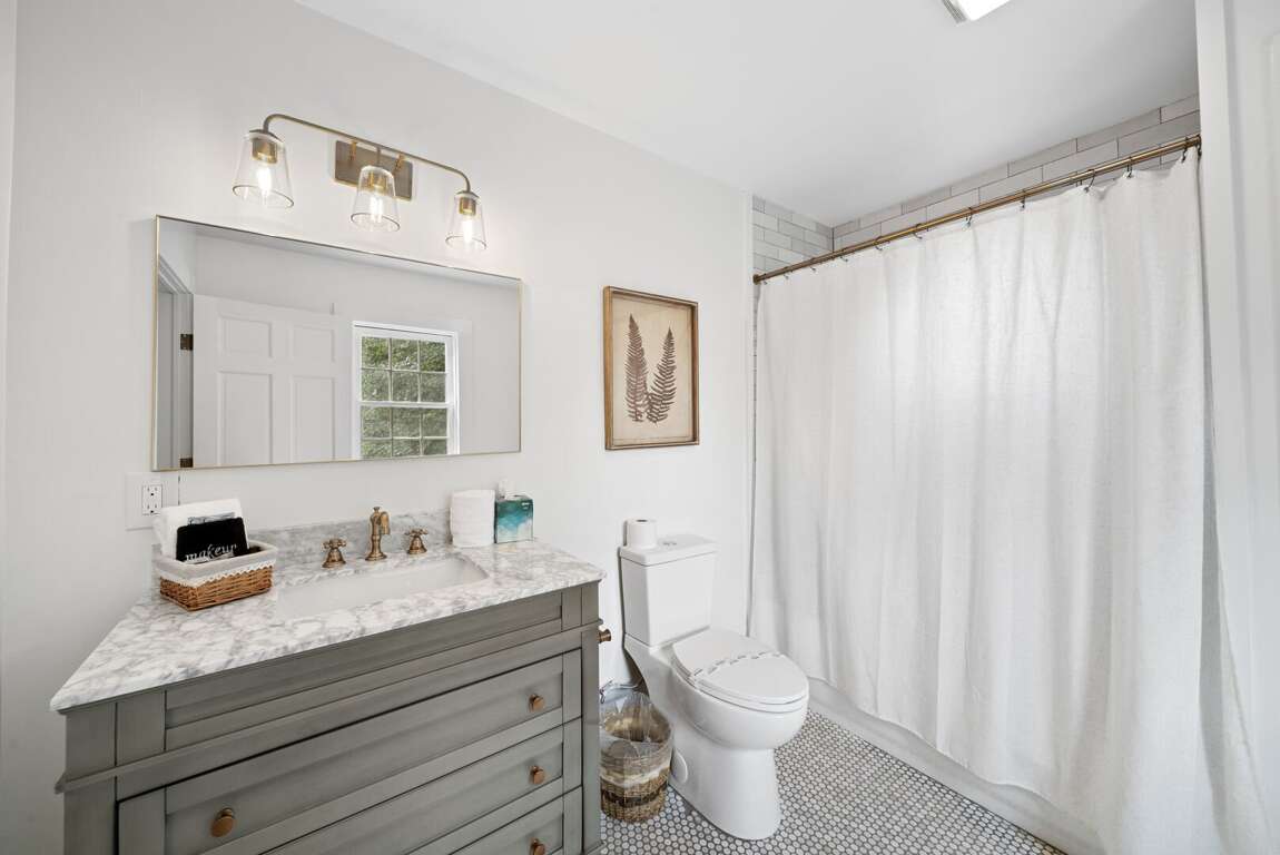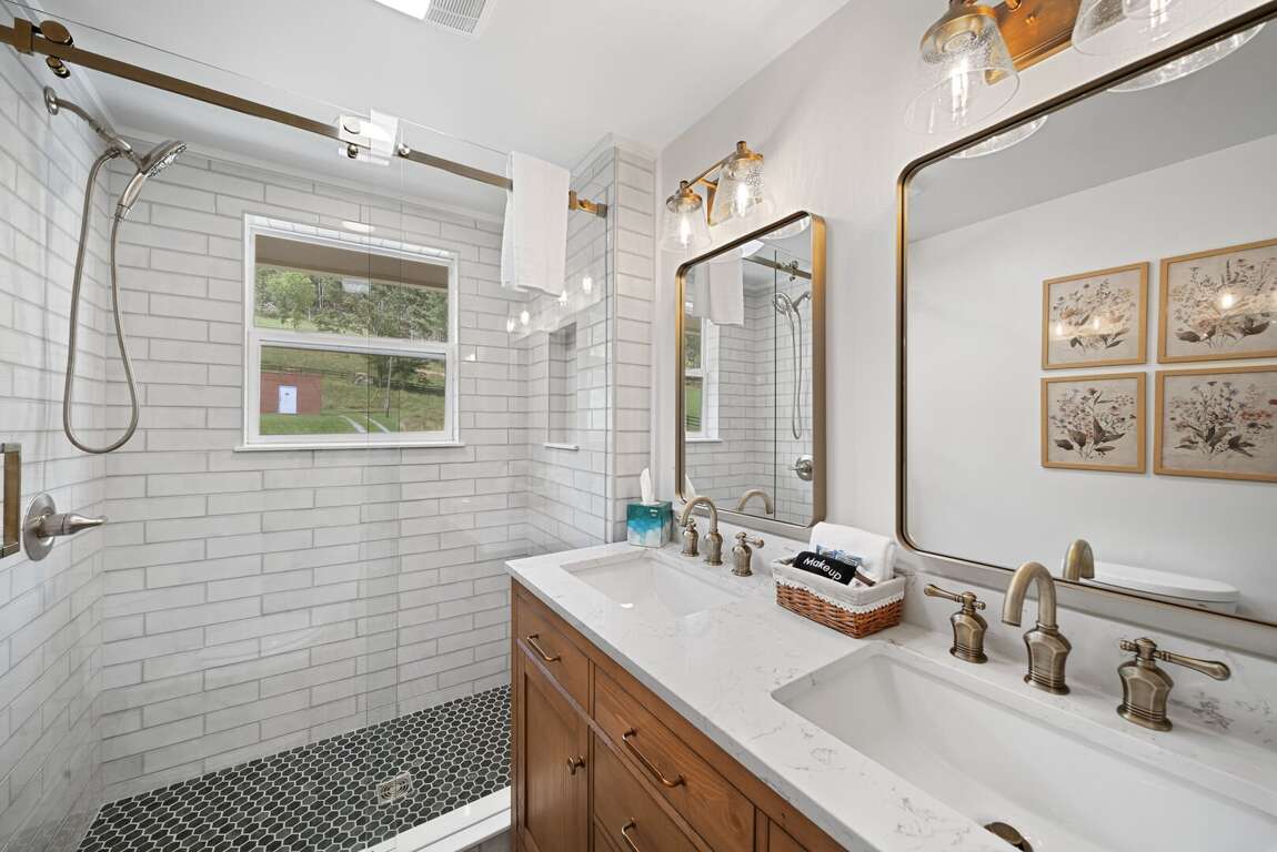 A serene queen bedroom and a bright bedroom with two full beds share a well-appointed hallway bathroom. This shared bath is both stylish and spacious, offering a double vanity and a custom tiled shower that make mornings with a full house feel effortless. An additional half bath is conveniently located nearby.<br />